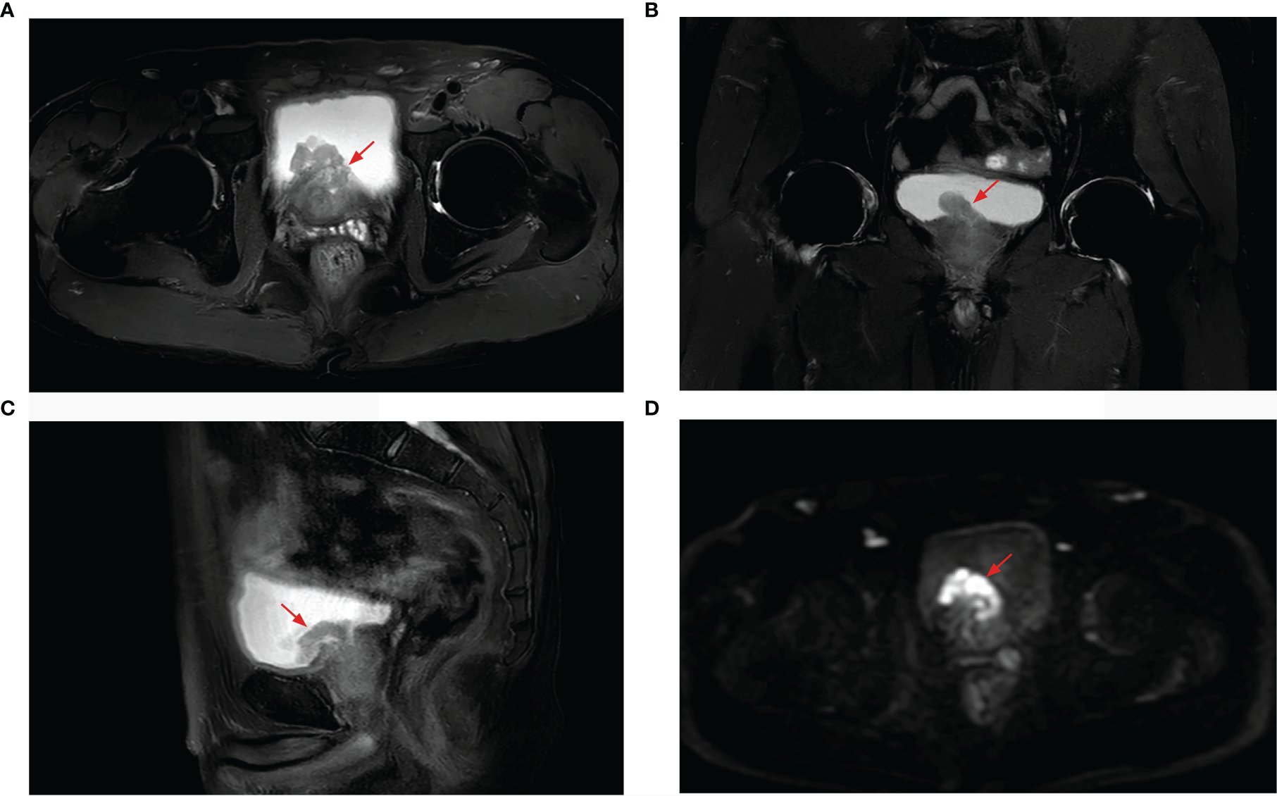 Prostate MRI revealing prostate cancer with bladder invasion, a marked hyperintensity on T2-weighted imaging [(A) axial, (B) coronal, (C) sagittal], and hypointensity on diffusion-weighted imaging (D).