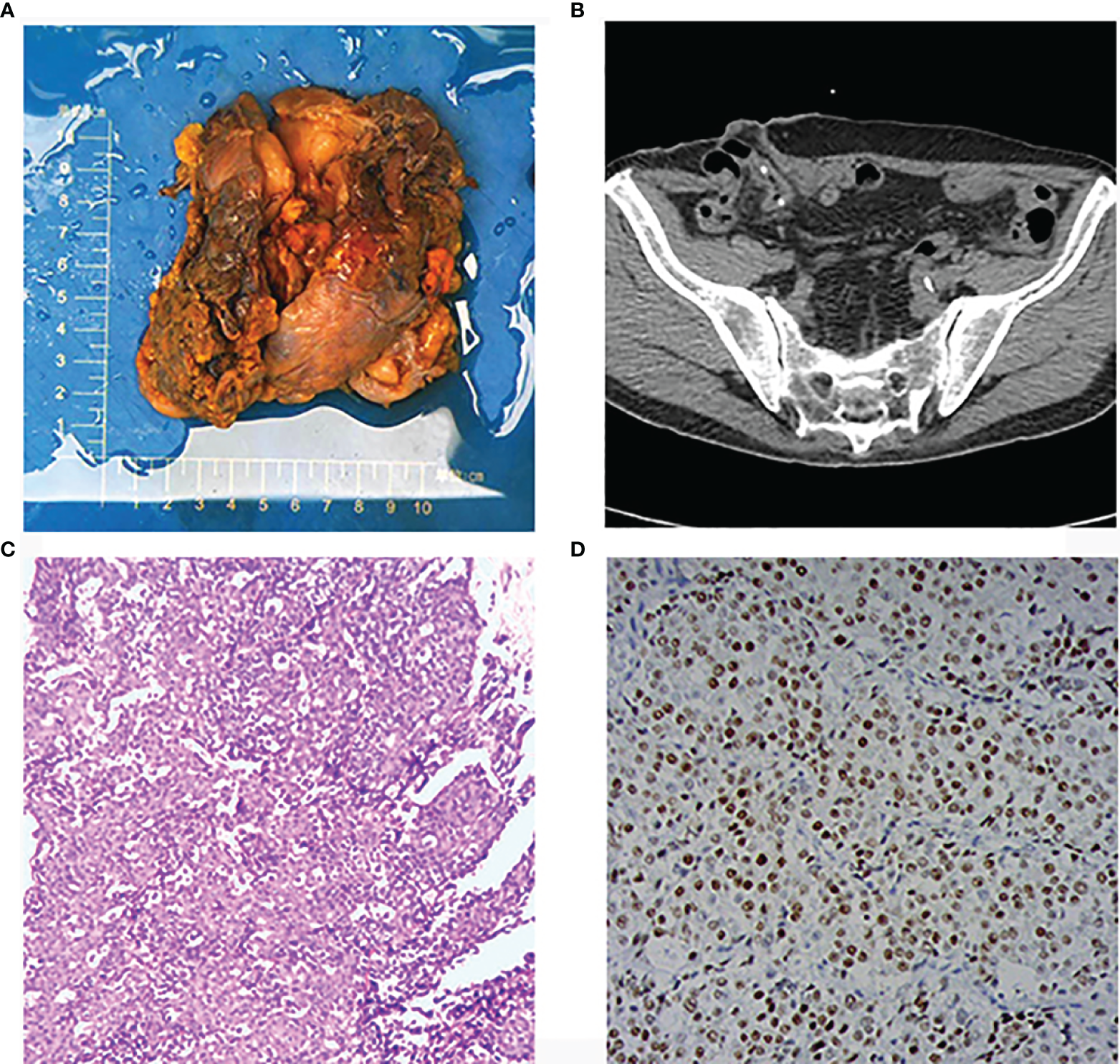 (A) Gross specimen of the prostate with a small bladder tissue. (B) Ileocystoplasty was performed and a new urinary excretory system was reconstructed. (C) H&E staining of bladder invasion lesions showing poorly differentiated prostatic adenocarcinoma with a Gleason score of 5 + 5 = 10. (D) Immunohistochemical staining result, NKX3.1(+).