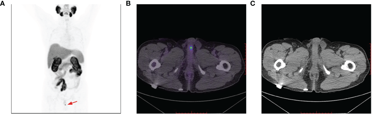 A 18F-PSMA-1007 PET/CT avid solitary penile lesion with a SUVmax of 6.4 (A, B); no morphological abnormalities of the penis detected on CT imaging (C).