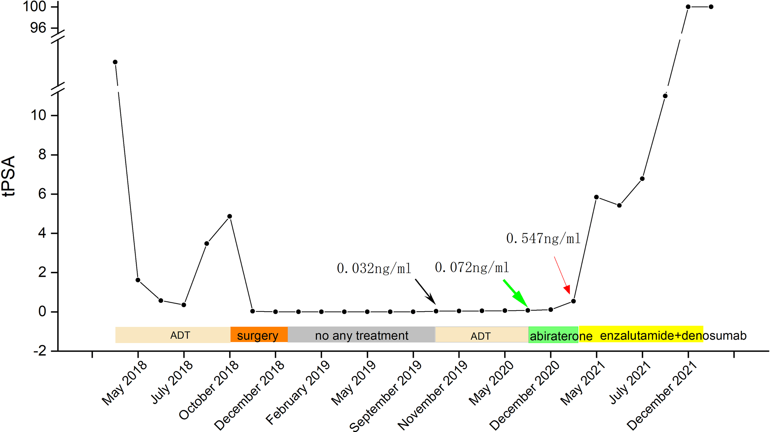 Timeline of the PSA level and treatment (green arrow—a positive result of 18F-PSMA-1007 PET/CT imaging with a PSA of 0.072 ng/ml; black arrow—an elevated PSA of 0.032 ng/ml; red arrow—an elevated PSA of 6.79 ng/ml).