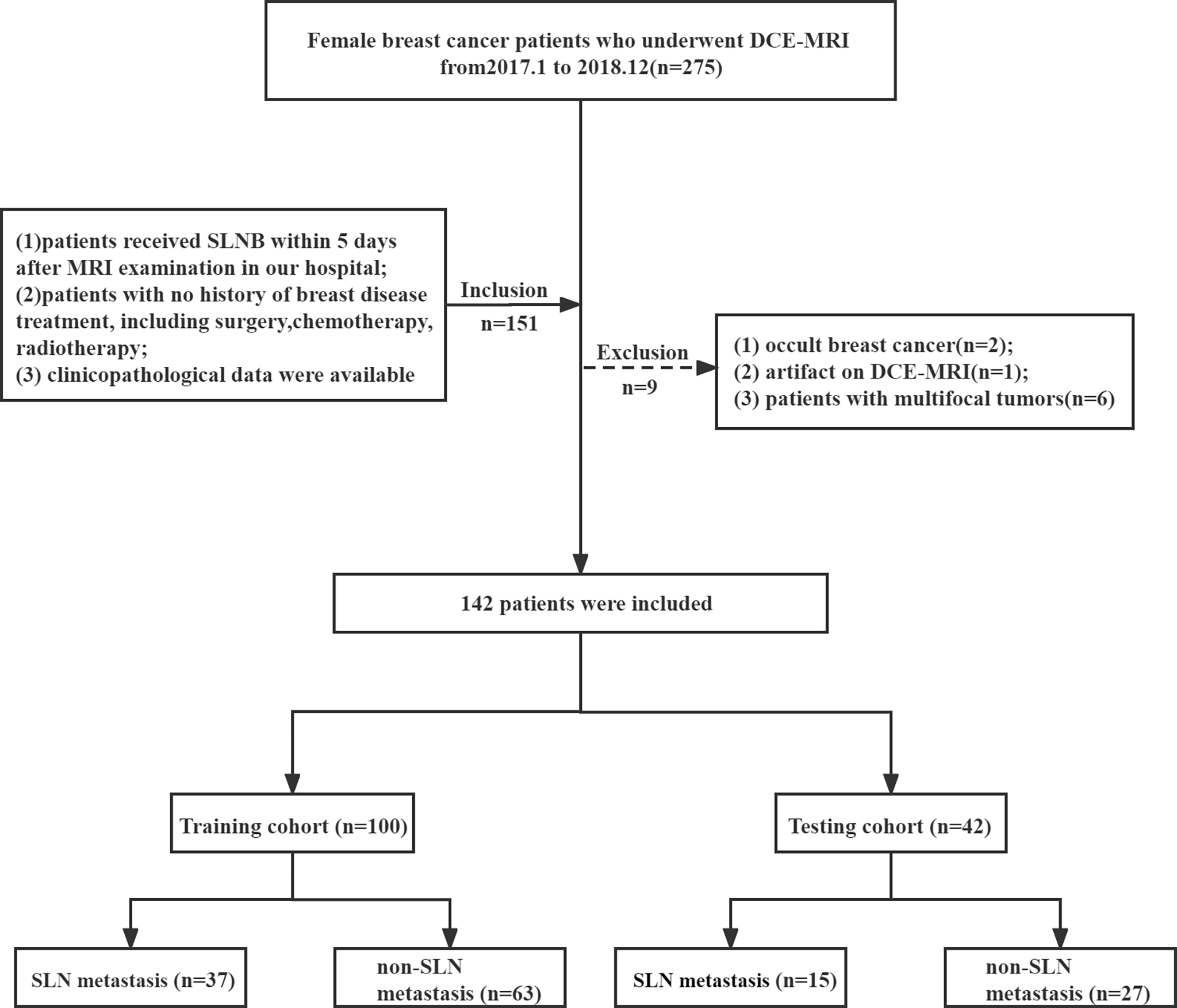 A total of 142 female primary BC patients with histology confirmed from January 2017 to December 2018 at our breast disease center were enrolled. The inclusion criteria were as follows: 1) patients received SLNB within 5 days after MRI examination in our hospital; 2) patients without breast disease treatment, including surgery, chemotherapy, and radiotherapy; and 3) clinicopathological data were available. The exclusion criteria were as follows: 1) occult BC; 2) artifact on DCE-MRI; 3) patients with multifocal tumors. The clinicopathological data were collected from the patients’ medical records.