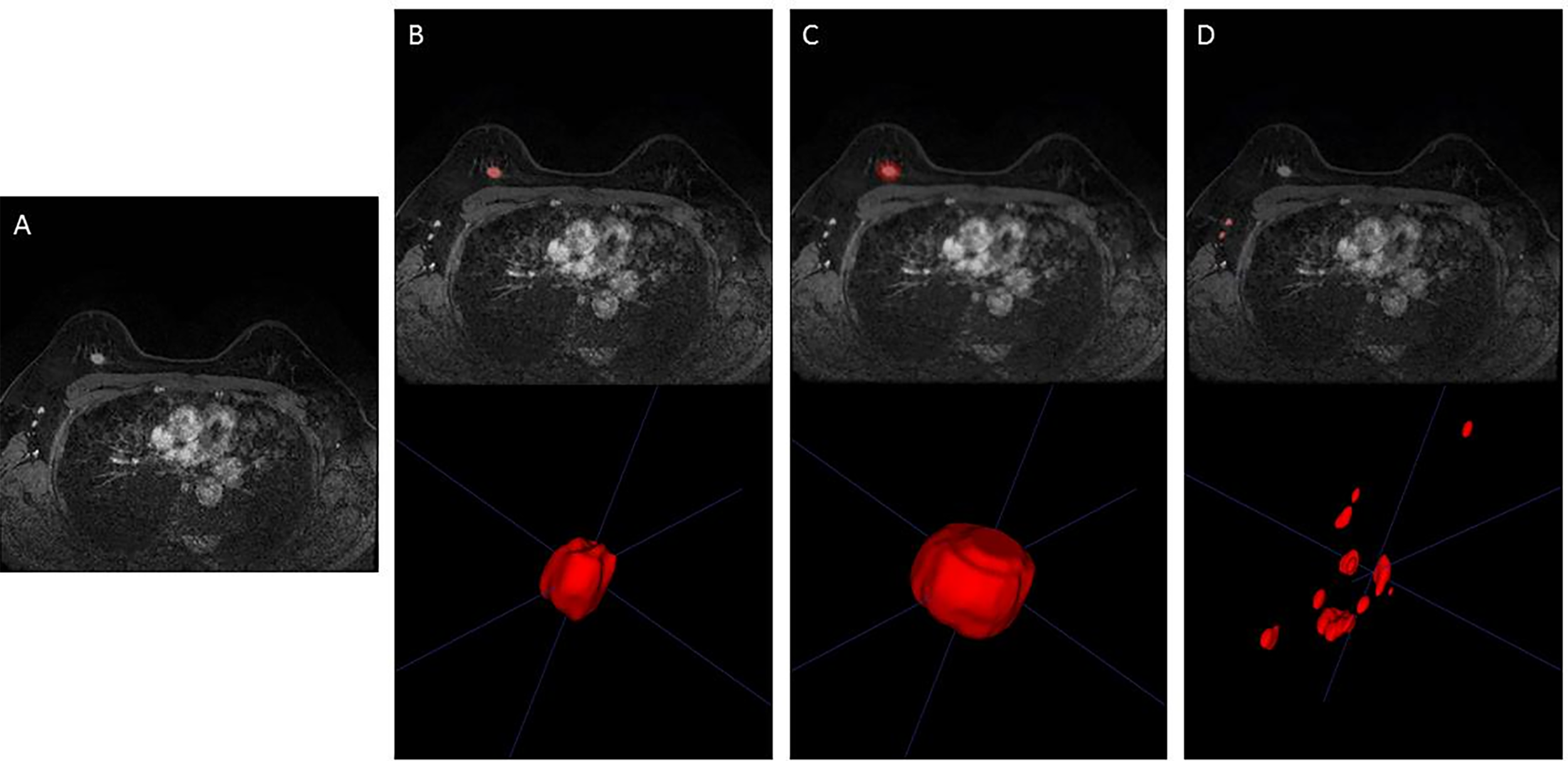 Representative image segmentation. (A) DCE-MRI of a 48-year-old woman with breast cancer in the third phase. (B) Segmentation of breast tumor (ROI of Model 1). (C) Segmentation of intra- and peri-breast tumor (ROI of Model 2). (D) Segmentation of ALN (ROI of Model 3). DCE-MRI, dynamic contrast-enhanced MRI; ROI, region of interest; ALN, axillary lymph node.