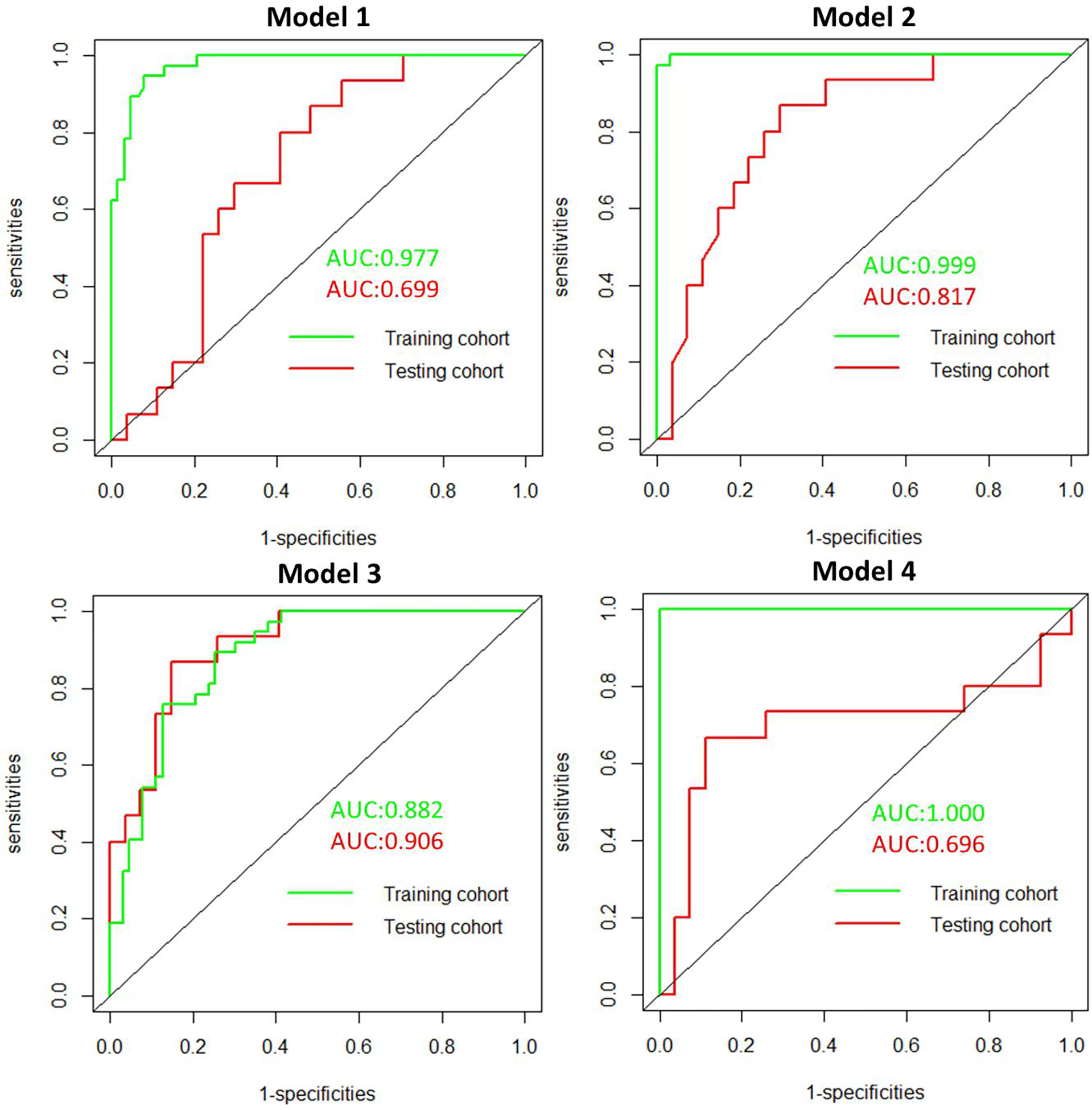 Receiver operating character (ROC). ROC of the 4 radiomics models in the training and testing cohorts.