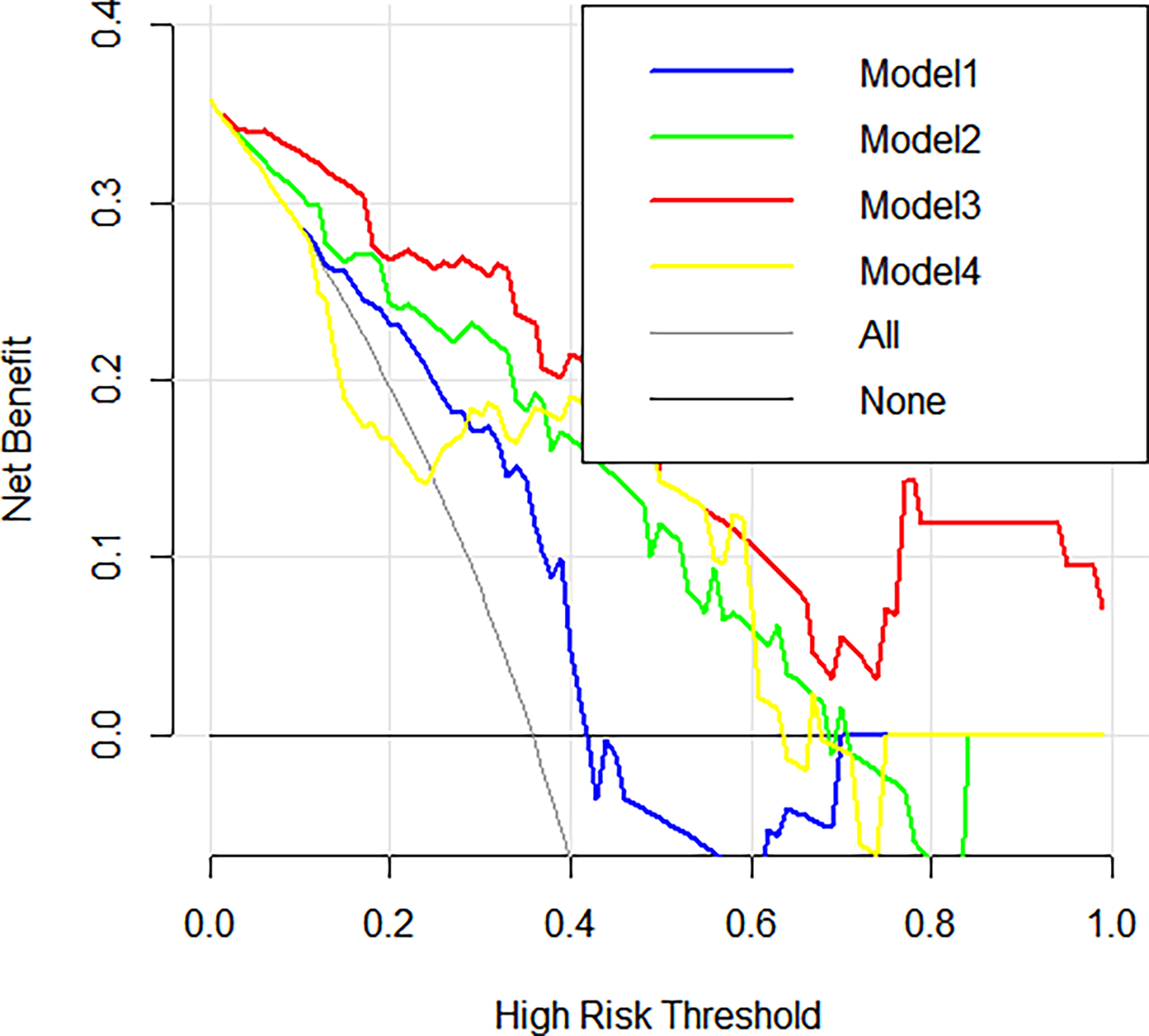 The radiomics features (n = 10, 11, 6, and 6) used in Models 1, 2, 3, and 4 respectively are shown in Supplementary Table 3. The optimal cutoff values of 0.630, 0.537, 0.649, and 0.556 were determined by the ROC curve analysis of Models 1, 2, 3, and 4 in the training cohort. The AUC, sensitivity, specificity, accuracy, geometric mean, precision, and F1-score of the 4 models are shown in Table 3. The best model analyzed by TOPSIS through the decision matrix was Model 3, the 2nd was Model 2, the 3rd was Model 4, and the 4th was Model 1. Models 1, 2, 3 and 4 yielded the best performance (AUC) in predicting SLN metastasis in the testing cohort (AUC = 0.699, 0.817, 0.906, and 0.696, respectively) (Figure 4). Model 3 had the highest AUC in the testing cohort, and only the difference from Model 1 was statistically significant (p = 0.022) (Figure 5). In addition, the DCA showed that Model 3 yielded a greater net benefit to predict SLN metastatic stations than the other two models in the testing cohort (Figure 6).