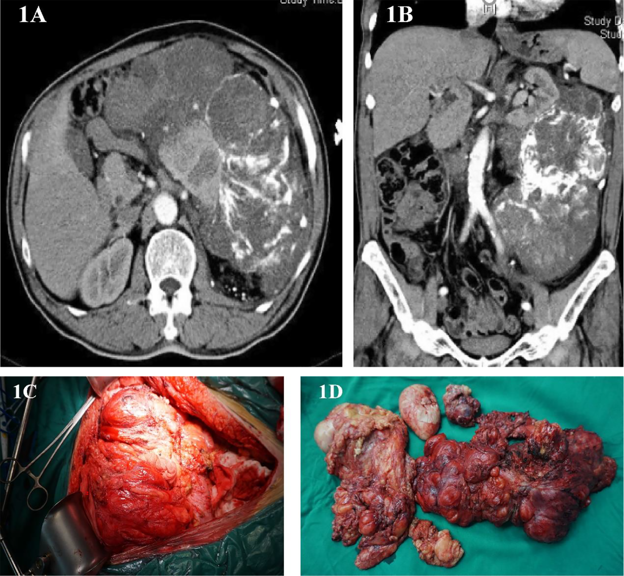 This is a 60-year-old male who found an abdominal mass for 8 months. His waist circumference gradually increased, during which no treatment was taken. The patient was in good health and had no history of cancer. In March 2012, he was hospitalized due to upper abdomen discomfort. Physical examination of his upper abdomen revealed a huge mass. Tumor markers such as carcinoembryonic antigen (CEA), carbohydrate antigen199 (CA-199), carbohydrate antigen 125 (CA125), carbohydrate antigen 50(CA50), alpha-fetoprotein (AFP) are all within the normal range. Abdominal CT scans showed a huge lump around the left kidney, considering malignant tumors (Figures 1A, B). On March 14, 2012, we performed a radical surgical resection on the patient. Operation name: retroperitoneal tumor resection+ left nephrectomy+ left adrenalectomy. Part of the tumor is tough, most of it is hard and bony, which surrounds the kidney and adheres to the surface of the kidney. During the operation, the kidney could not be stripped, and it is suspected that the sarcoma has invaded the kidney (Figure 1C). In order to maximize the marginal negative resection, so as to reduce the recurrence rate of tumor after surgery. The surgeon decided to perform combined organ resection and removed the left kidney and left adrenal gland (Figure 1D). The postoperative pathology was dedifferentiated liposarcoma, and the dedifferentiated component was like myxofibrosarcoma, which invaded the kidney tissue, and did not involve the ureteral stump and adrenal gland. Tumor components were seen around the renal hilar vessels. The patient’s vital signs were stable after surgery and was discharged from hospital on March 22, 2012.