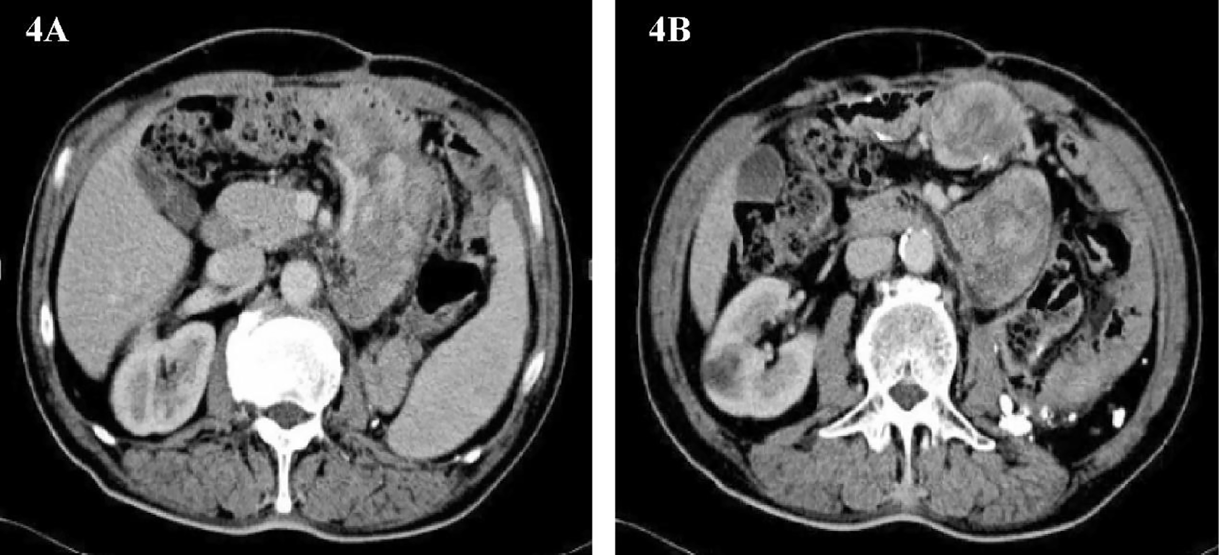 One and a half years later, the patient’s imaging examination revealed that the tumor had recurred again (Figures 3A, B). We performed the third operation for the patient on June 9, 2014. Operation name: Resection of retroperitoneal tumor + partial resection of colon splenic flexure. The postoperative pathology was dedifferentiated liposarcoma, and some areas showed rhabdomyosarcoma differentiation. Immunohistochemistry : MyoD1(+), Myogenin (+), SMA(+), CD117(+), Caldesmon(+), CD34(-), Dog-1(-), S-100(-). The Ki67 positive rate is about 30%. The postoperative nutritional status of the patient was poor, and the abdominal incision appeared fat liquefaction. We change the dressing for patients twice a day. The patient’s abdominal wall incision was dehisced on the 8th postoperative day, and he entered the operating room again for debridement and suture. After the operation, the patient was given anti-infection and nutritional support, and the stitches were removed smoothly two weeks later. The patient was discharged on July 15, 2014.
