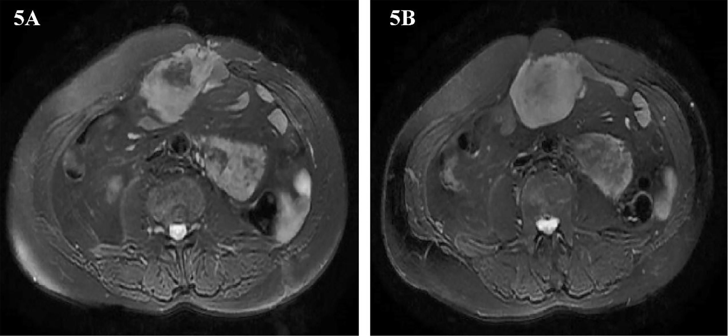 Two years later, abdominal MRI showed abnormal signal shadow on the lower edge of the spleen again, and metastasis was considered. There were tumors around the operation area and the inner edge of the anterior abdominal wall incision. Multiple space-occupying lesions in the abdominal cavity, considering the possibility of malignant tumor recurrence and metastasis (Figures 5A, B). The multidisciplinary team of experts (MDT) assessed the patient’s condition and believed that the operation could be performed. Our team performed the fifth operation on the patient on December 8, 2016. Operation name: Retroperitoneal tumor resection + partial splenectomy + partial small bowel resection + intestinal adhesion lysis + abdominal wall tumor resection. The sarcoma encapsulates the distal end of the spleen and occupies a small area. Considering the low risk of the spleen at the margin of resection, it was decided to remove the sarcoma along with part of the spleen. This partial splenectomy is not related to the previous partial splenectomy. The spleen part of the two excisions was small, which did not affect the function of the spleen, and there was no postoperative bleeding. The postoperative pathology was dedifferentiated liposarcoma, some areas showed rhabdomyosarcoma differentiation, and some areas showed malignant fibrous histiocytoma. Immunohistochemistry: Pathological section No. 3: SMA(+), S100(+), CD68(+), MyoD1(-), Myogenin(-), HMB45(-), Ki-67 positive rate is about 20%. Pathological section No. 3: SMA(+), MyoD1(+), Myogenin(+), CD68(-), HMB45(-), S100(-), Ki-67 positive rate is about 20%. The patient was discharged on the 11th day after surgery.