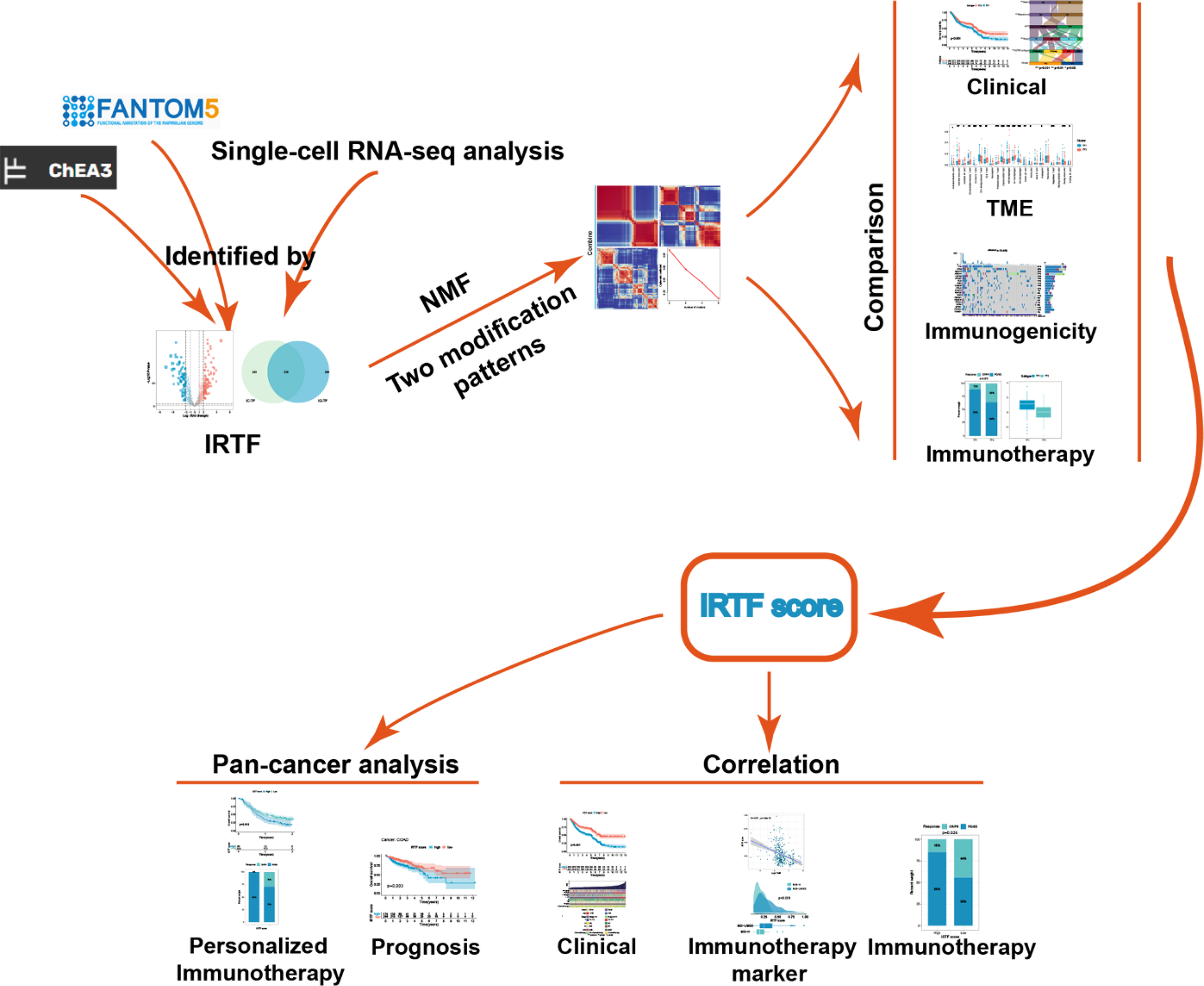 Due to limitations of classical experimental science, these studies were limited to one or two TFs and cell types, but the interaction between tumorigenesis and anti-tumor immunity is a synergistic process in which multiple TFs are activated. Therefore, We first defined IRTFs through the transcription factor enrichment analysis of the ChEA3 database and the differential analysis of FAMTOM5. Subsequently, we identified the IRTF regulation pattern by NMF and comprehensively recognized the prognostic and immunological landscape mediated by the regulation patterns of IRTFs. Finally, a scoring system was developed to quantify this pattern and its prognostic value were further analyzed.