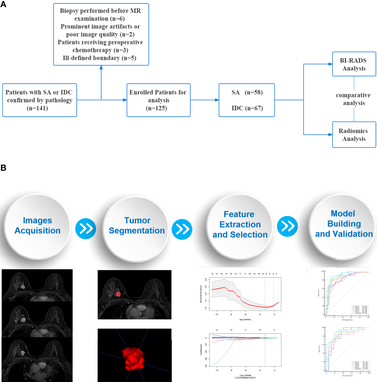 Patients who underwent DCE-MRI examination between January 2015 and December 2019 were retrospectively collected in two institutions. The inclusion criteria for the study were as follows: (1) Patients were pathologically confirmed SA or invasive ductal carcinoma (IDC). (2) Patients received breast MRI examination within 2 weeks before surgery. (3) MRI scans were available for qualitative and radiomic analysis. (4) The boundary of the lesions was well-defined on MRI. (5) No previous chemotherapy or radiation therapy. (6) No biopsy or surgery before MRI examination.