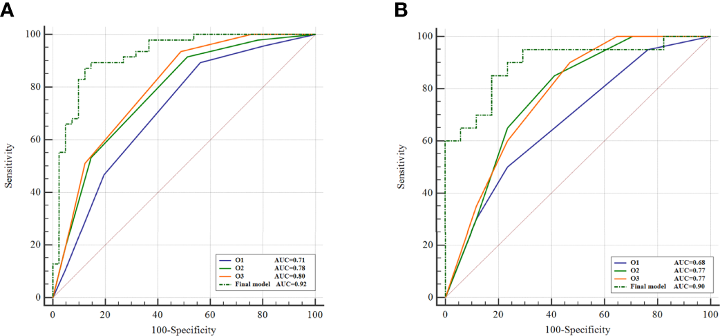 The AUC values of the three observers (O1, O2, and O3) were 0.71 (95%CI [0.60, 0.80] p<0.001), 0.78 (95%CI [0.67, 0.86] p<0.001), and 0.80 (95%CI [0.70, 0.88) p<0.001] in the training cohort, respectively (Table 1; Figure 2). There were statistically significant differences between O1 and O2, O3 (O1 vs O2, p = 0.001; O1 vs O3, p < 0.001), and there was no statistically significant difference between O2 and O3 (p=0.116). In the validation cohort, the AUC values of the three observers were 0.68 (95%CI [0.50, 0.82] p = 0.042), 0.77 (95%CI [0.61, 0.89] p < 0.001) and 0.77 (95%CI [0.61, 0.89] p < 0.001), respectively (Table 1; Figure 2). There were statistically significant differences between O1 and O2, O3 (O1 vs O2, p < 0.001; O1 vs O3, p < 0.001), and there was no statistically significant difference between O2 and O3 (p = 0. 94).