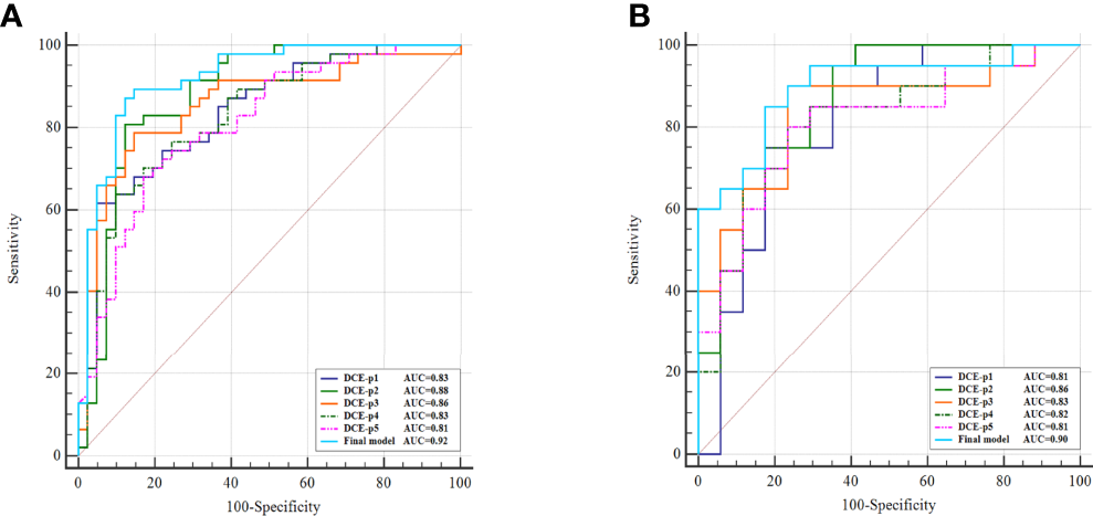 The diagnostic performance of the single-phase enhancement and the final model of radiomics was validated using external validation data collected from institution II, with the AUCs ranged from 0.81 to 0.86 for the five single-phase enhancement of radiomic analysis. And the DCE-phase2 obtained the highest AUC value of 0.86 (95%CI [0.71, 0.95] p < 0.001). The final model displayed AUC of 0.90 (95%CI [0.75, 0.97] p < 0.001).