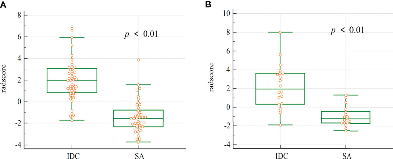 The box plot of the radscore in the final model. Mann-whitney analysis of radscore for distinguishing SA from IDC in the training cohort (A) and validation cohort (B) (p < 0.01).