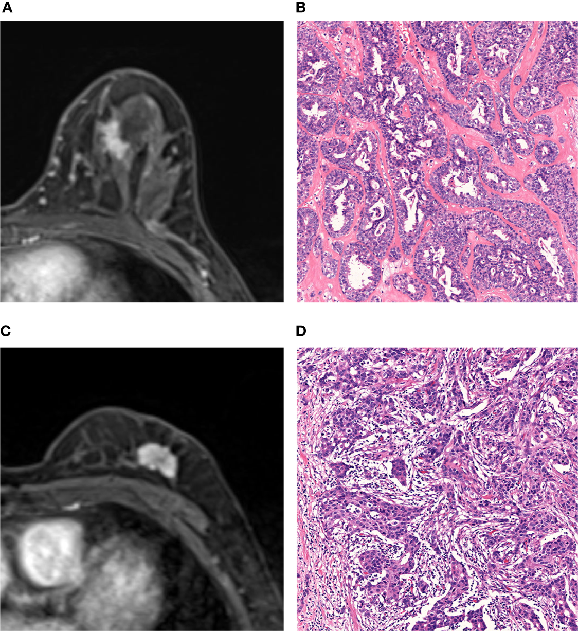 MRI and histopathologic findings of two cases of SA and IDC. (A, B) MRI and histopathologic findings of a 47-year-old woman with SA. The DCE-MRI image showed an irregularly shaped mass with spiculated margin and heterogeneously enhancement (A). The lesion was classified as malignant by BI-RADS analysis and benign by radiomic analysis. Histopathological examination proves SA (Hematoxylin-eosin staining; original magnification×100) (B). (C, D) MRI and histopathologic findings of a 66-year-old woman with IDC. The DCE-MRI image showed an irregularly shaped mass with lobulated margin and heterogeneously enhancement (C). The lesion was classified as malignant by both BI-RADS analysis and radiomic analysis. The histopathologic result was IDC (Hematoxylin-eosin staining, original magnification×100) (D).