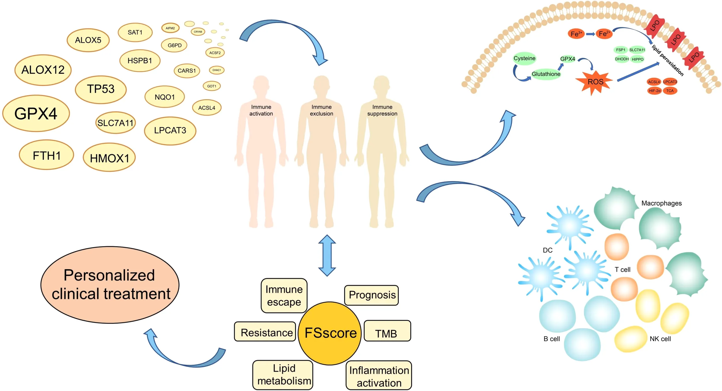 This project revealed that the occurrence of ferroptosis is closely related to the complex pathological changes in the TME. Patients with different TME features show differences in terms of ferroptosis sensitivity. Immune cell infiltration, inflammation development and lipid metabolism are important regulatory factors that affect the occurrence of ferroptosis. The comprehensive analysis of ferroptosis-related molecular patterns in individual patients can provide references for the clinical evaluation of patient pathological characteristics and the design of personalized treatment plans.