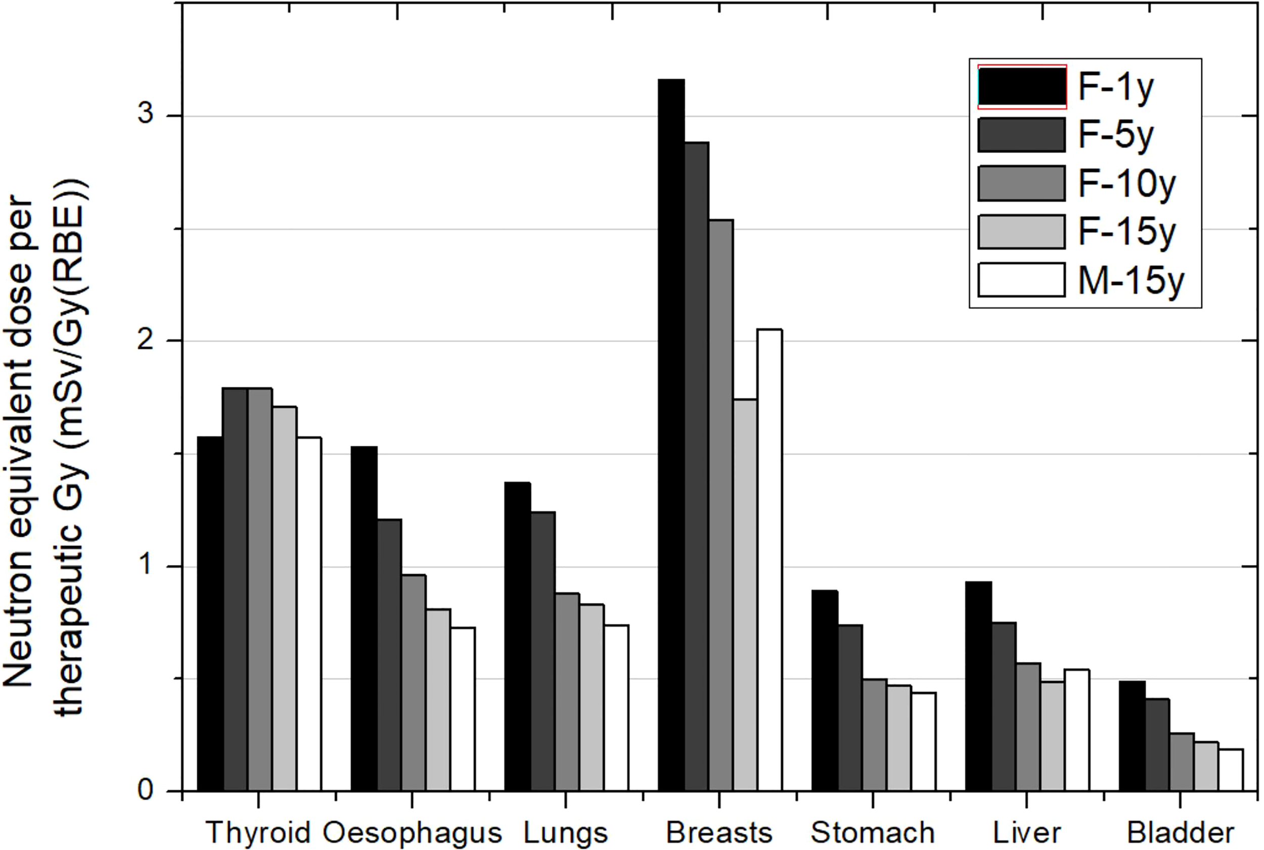 Figures 1–3 depict the neutron equivalent doses in several organs evaluated by the different works already discussed. From these data, it is possible to extract the ranges of neutron equivalent doses that a child could receive as a consequence of the brain treatment. In Figure 1, the effect of patient age can be noticed. For the thyroid, a close organ to the target, equivalent doses are similar among the phantoms, with an average of 1.69 mSv/Gy (RBE). In the rest of the organs, older patients do present lower doses. Equivalent dose in lungs ranges from 1.37 mSv/Gy (RBE) in the 1-year-old phantom to 0.83 mSv/Gy (RBE) in the 15-year-old phantom. In the abdomen, for instance, liver equivalent doses range from 0.93 mSv/Gy (RBE) to 0.49 mSv/Gy (RBE) for the 1-year-old and 15-year-old phantoms, respectively. Equivalent doses are below 0.5 mSv/Gy (RBE) in bladder for all phantoms. Equivalent doses in breasts have higher doses for all the phantoms [between 3.16 and 1.75 mSv/Gy (RBE)]. This is a consequence of the shallow depth of the tissue, which makes it more exposed to external neutrons. Consistently, male phantoms had a higher equivalent dose in comparison with female phantoms.