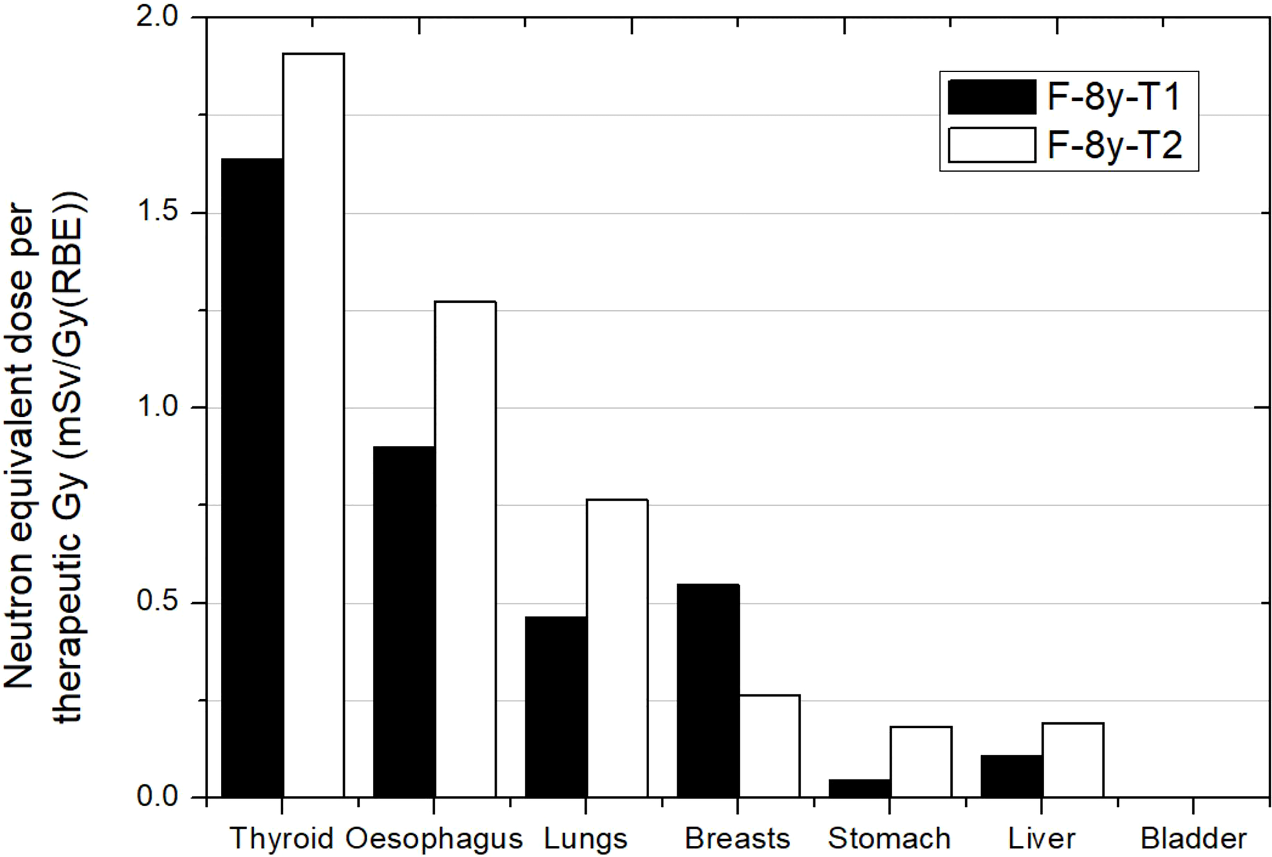 Figure 3 Neutron equivalent doses per therapeutic Gy in selected organs for 2 different brain treatments in the same passive scattering proton beam facility. T1 corresponds to an irradiation with a lateral incidence and a target volume of 514 cm3. T2 corresponds to an irradiation with an oblique-inferior incidence and a target volume of 306 cm3. Equivalent doses in bladder were too low for the plot scale. Data extracted from Zacharatou-Jarlskog et al. (33).