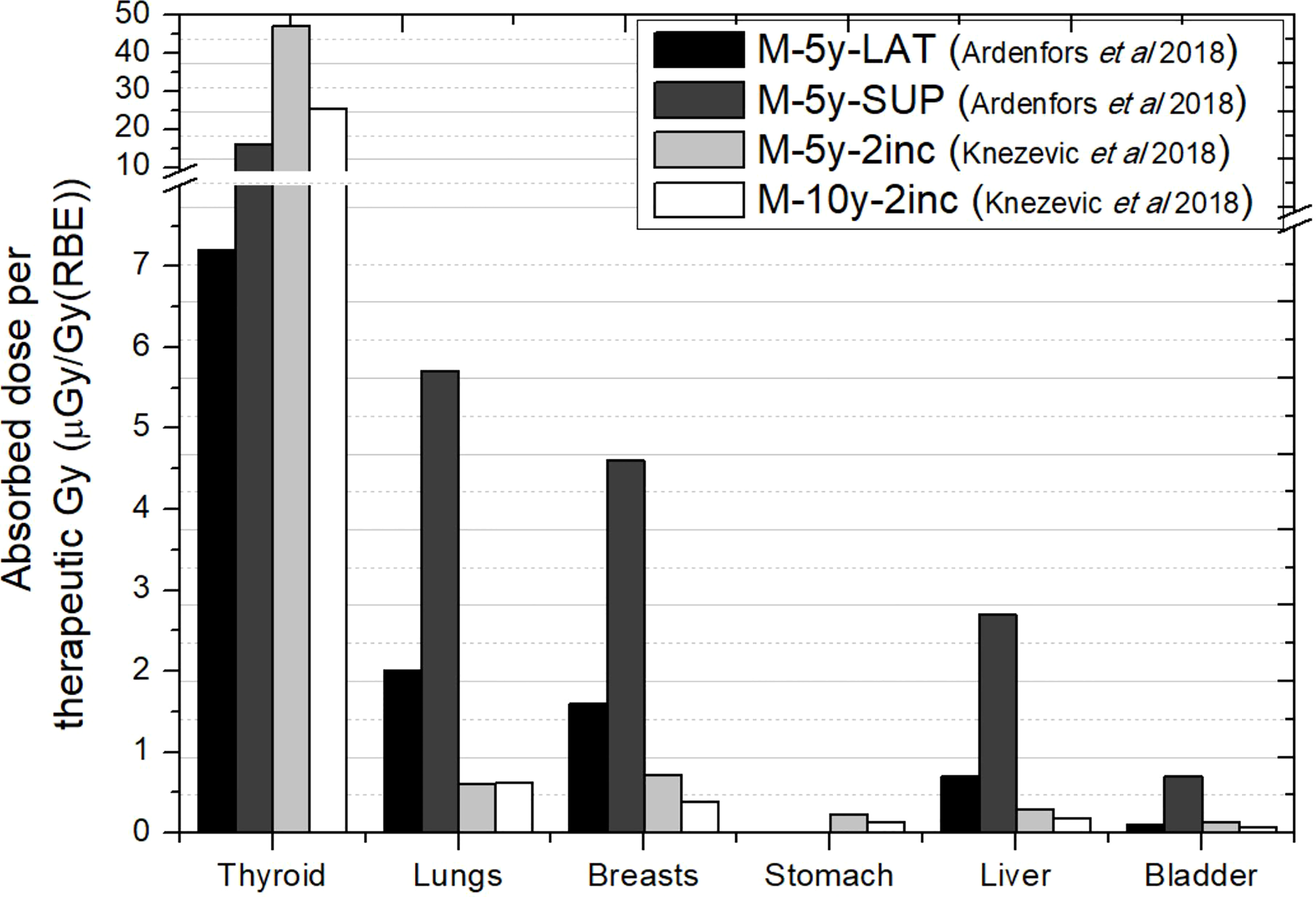 Figure 4 shows the comparison between Ardenfors et al.’s (36) total absorbed doses and photon absorbed doses in Knežević et al. (38). As can be noticed, results are not compatible in thyroid, taking into account that Ardenfors et al. (36) results included both photons and neutrons. Some explanation can be found in the different target volume and the proton energy range of treatments in both works. While, in Knežević et al. (38), the target has a volume of 65 cm3 and proton energies range from 70 to 140 MeV, in Ardenfors et al. (36), these parameters were 24 cm3 and 80–110 MeV in the lateral field and 92–124 MeV in the superior field. Therefore, higher values were expected in Knežević et al. (38), although there must be other facts behind the observed inconsistency. For the remaining organs, results in Ardenfors et al. (36) were on average 5 times higher than in Knežević et al. (38). Given the result in thyroid, it is not possible to assign this difference only to neutron contribution.