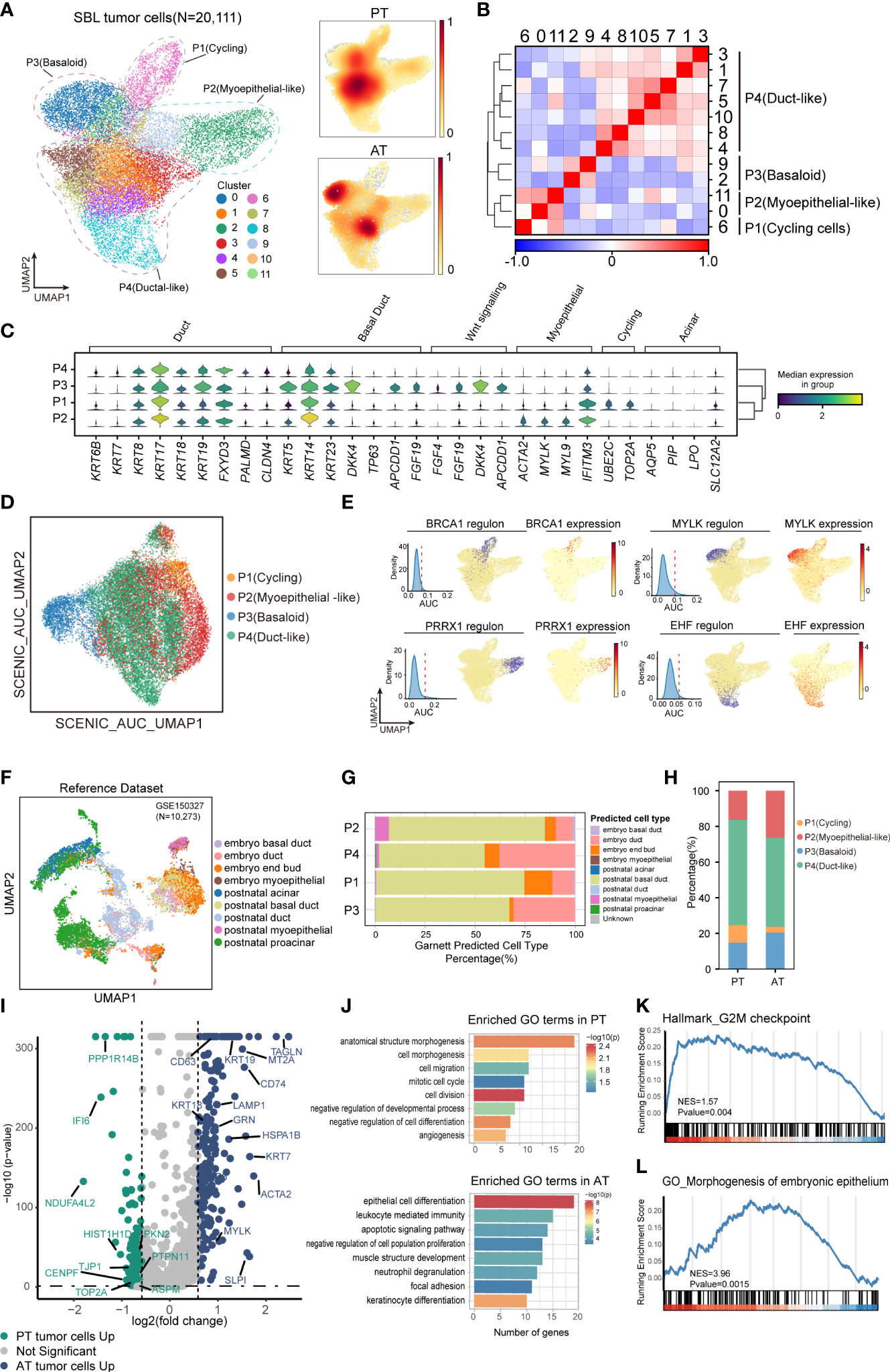 The intratumoral heterogeneity within SBL tumor cells. (A) UMAP visualization of 20,111 tumor cells from SBL colored by clusters (left) and density of sample distribution(right). UMAP, uniform manifold approximation and projection. (B) Heatmap displaying the Pearson correlation coefficients calculated between average gene expressions of tumor clusters. (C) Violin plots showing the expression distribution of selected genes involved in cell cycle genes, Wnt signaling pathway, and markers specific to duct, myoepithelial, basal and acinar cells in SBL tumor expression programs. (D) UMAP visualization of 20,111 tumor cells from SBL based on Scenic regulon AUC scores. AUC, area under the ROC Curve. (E) UMAP visualization of specific transcription factor expression and regulon activity. For four transcription factors: (left) histogram of AUC values, together with the chosen cutoff (red dashed line); (middle)the cells with AUC value over the cutoff value are shown in purple, where the regulon is considered active; (right) the expression of the transcription factor is shown. (F) UMAP visualization of murine embryo and postnatal salivary gland datasets curated from GSE150327.Colors indicated different cell types used for Garnett classifier training. (G) Bar plot indicating the percentage of tumor subtypes corresponding to 9 developing cell types. Tumor cells were assigned to different identities predicted by Garnett. (H) Bar plot indicating the percentage of tumor subtypes in SBL PT and AT samples. (I) Volcano plot showing differentially expressed genes between PT (green dots) and RT tumor cells (blue dots). The names of selected important genes are indicated in the plots. (J) Bar chart showing the enrichment of GO terms, based on top50 upregulated genes in PT or AT malignant cells. GO, gene ontology. (K) GSEA enrichment plot of expression signatures of Hallmark_G2M checkpoint in SBL PT malignant cells. (L) GSEA enrichment plot of expression signatures of GO_Morphogenesis of embryonic epithelium in SBL AT malignant cells. SBL, sialoblastoma; PT, primary tumor; AT, tumor after treatment.