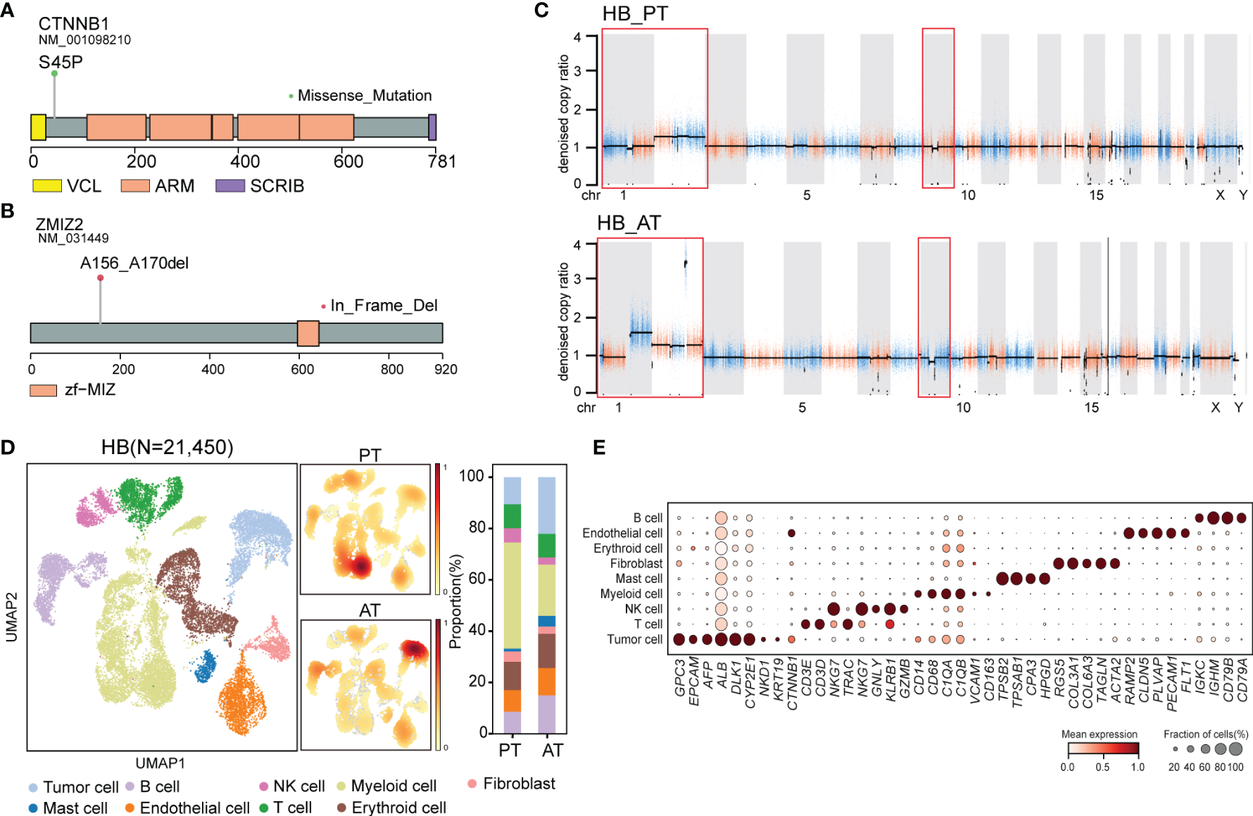 The genomic and transcriptomic landscape of HB (A) Lollipop plot showing CTNNB1 p.S45P mutation. Boxes represented functional domains. VCL, interaction with VCL; ARM, Armadillo/beta-catenin-like repeats; SCRIB, interaction with SCRIB. (B) Lollipop plot showing ZMIZ2 in-frame deletion. Boxes represented functional domains. Zf-MIZ, Zinc finger MIZ domain. (C) Scatter plots showing copy number alterations in HB PT and AT samples. (D) UMAP visualization of 21,450 cells from HB colored by cell types (left) and density of sample distribution(middle). Right panel showing the percentage of different cell types in HB PT and AT samples. (E) Dot plot for expression of cell-type-specific markers in HB. The color indicated scaled mean expression of marker genes, and the size indicated the proportion of cells expressing marker genes. HB, hepatoblastoma; PT, primary tumor; AT, tumor after treatment.