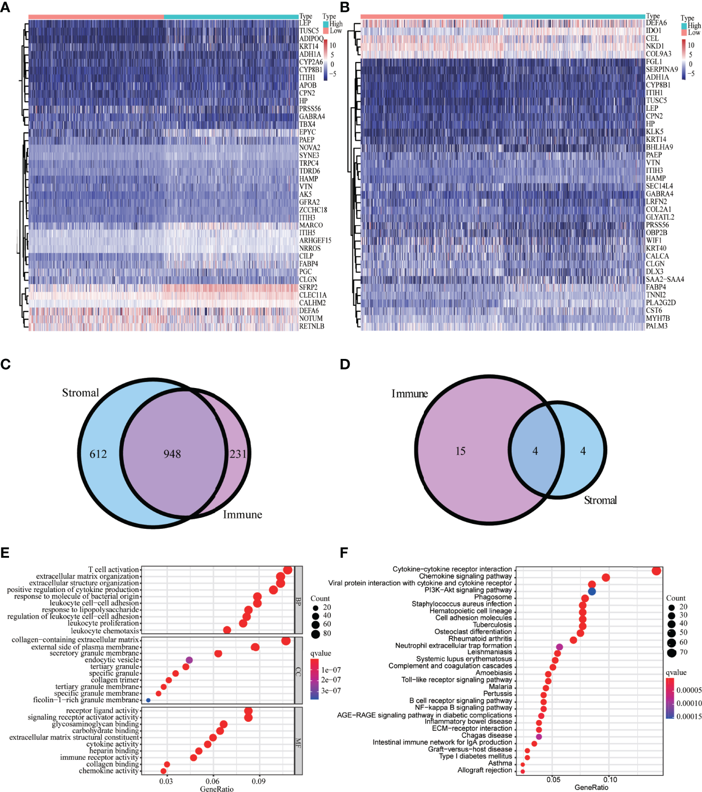 Analysis of DEGs-based stromal and immune scores. The heatmap of the top 40 DEGs based on stromal scores (A) and immune scores (B). Venn diagrams displaying the number of upregulated DEGs (C) and downregulated DEGs (D) detected in both groups. Top 30 enriched (p < 0.05) GO terms (E) and KEGG terms (F).