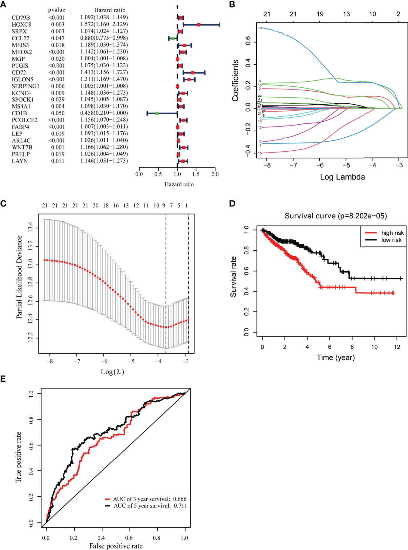 Identification of key prognostic genes within intersection DEGs. (A) Forest plot of risk genes: Red represented high-risk genes (hazard ratios, HR > 1); green represented low-risk genes (HR < 1). (B) Constructing the LASSO coefficient prediction model. (C) Selecting variables in LASSO regression with minimum criteria by 1,000 times cross-validation. (D) Overall survival between high- and low-risk score groups. (E) ROC curves for predicting 3- and 5-year overall survival probability with the nine-gene score.
