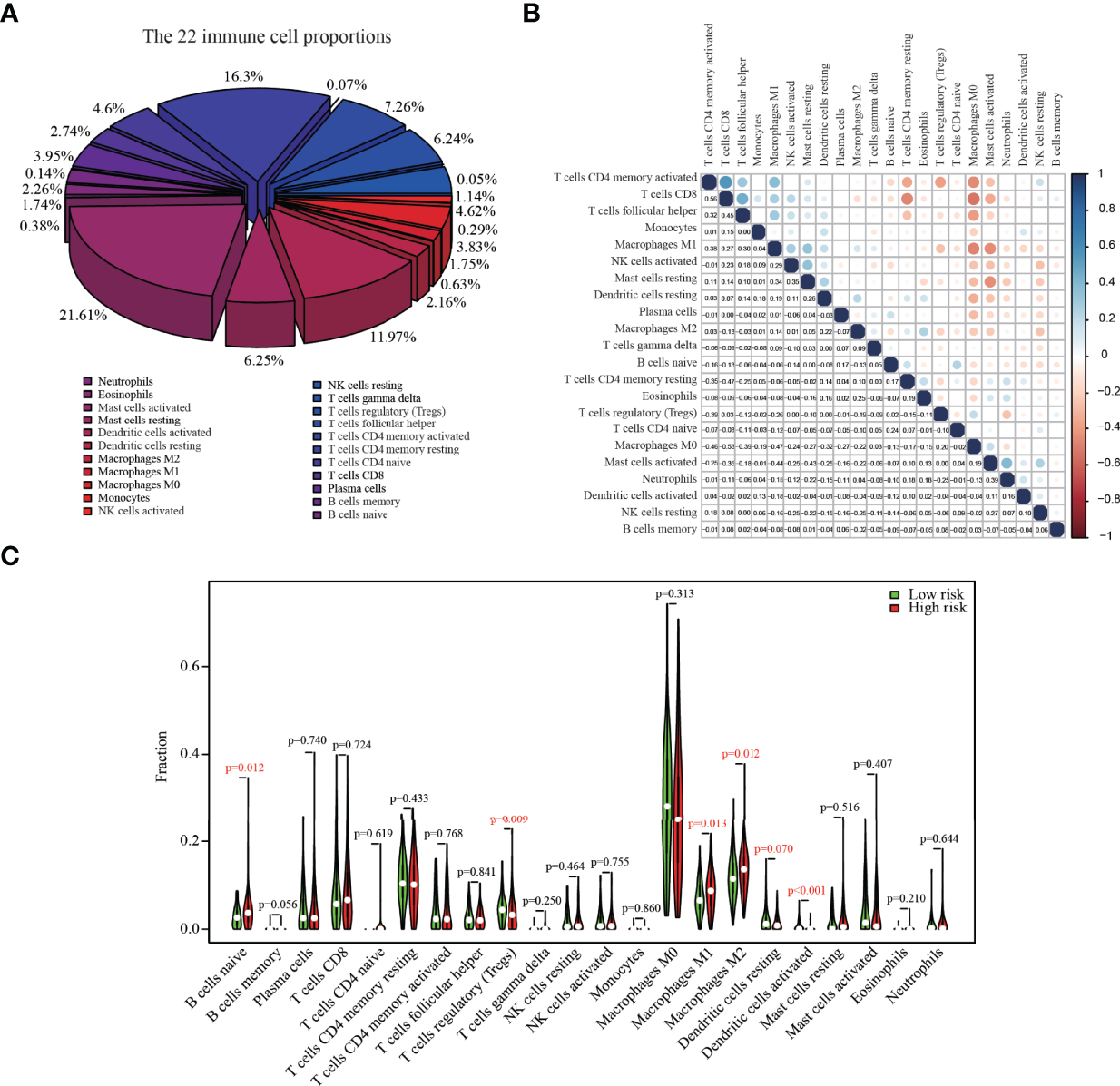 The composition of 22 immune cells in colon cancer tumors from the TCGA dataset. (A) The relative abundances of 22 immune cells in the tumor tissue of colon cancer patients. (B) The correlation matrix between different cell types; the size of the circle represented the degree of correlation. (C) Fractions of infiltrating immune cells in high versus low risk score groups.