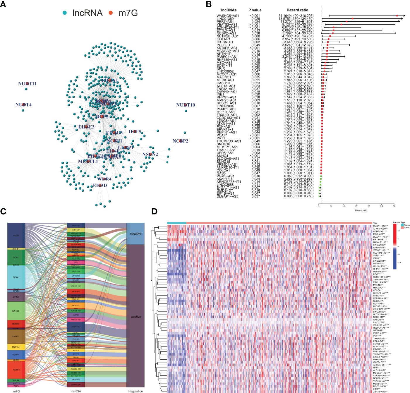 Identification and evaluation of the m7G-related lncRNAs. (A) Co-expression network of m7G-related mRNAs and lncRNAs. (B) Selection of prognosis-related lncRNAs with univariate Cox regression analysis. (C) The correlation between m7G-related mRNAs and lncRNAs with the Sankey diagram. (D) Expression difference analysis of the m7G-related lncRNAs. m7G, 7-methylguanosine; lncRNAs, long non-coding RNAs. *p < 0.05; **p < 0.01; ***p < 0.001.
