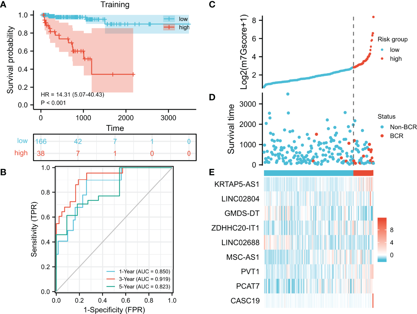 Development and evaluation of the m7G model. (A, B) Evaluation of the m7G model with Kaplan–Meier analysis (A) and time-dependent ROC curves (B). (C–E) Distribution of m7Gscore (C), BCR status (D), and model consisting of m7G-related lncRNAs (E). m7G, 7-methylguanosine; ROC, receiver operating characteristic; BCR, biochemical recurrence.