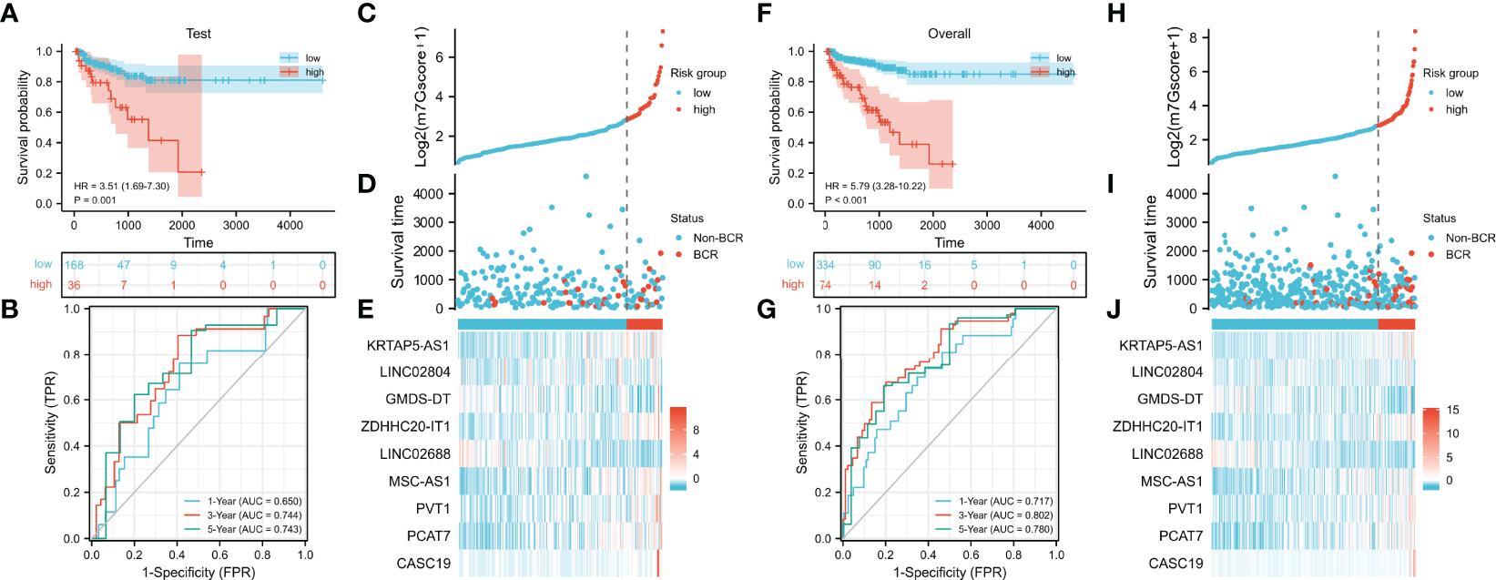 Validation of the m7G model. (A, B) Evaluation of the m7G model with Kaplan–Meier analysis (A) and time-dependent ROC curves (B) in the test set. (C–E) Distribution of m7Gscore (C), BCR status (D), and model consisting of m7G-related lncRNAs (E) in the test set. (F, G) Evaluation of the m7G model with Kaplan–Meier analysis (F) and time-dependent ROC curves (G) in TCGA cohort. (H–J) Distribution of m7Gscore (H), BCR status (I), and model consisting of m7G-related lncRNAs (J) in TCGA cohort. m7G, 7-methylguanosine; ROC, receiver operating characteristic; BCR, biochemical recurrence; TCGA, The Cancer Genome Atlas.