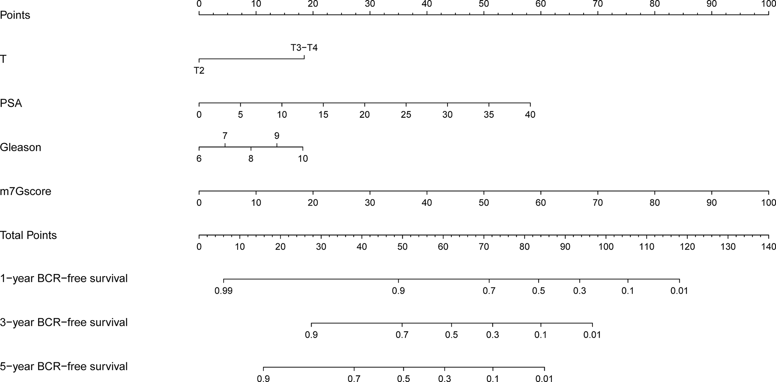 Based on the training set, a nomogram model was constructed by incorporating the m7Gscore and clinicopathological factors to estimate the 1-, 3-, and 5-year BCR-free survival. The univariate and multivariate Cox regression analyses were enrolled to calculate the coefficient. The nomogram for TCGA cohort was constructed with the “rms” R package and used calibration analysis to assess the accuracy. The concordance index (C-index), the Kaplan–Meier curves, and ROC curves evaluated the effectiveness.
