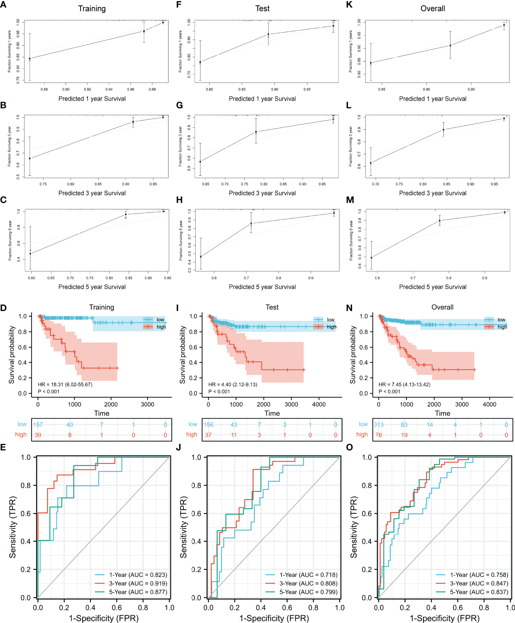Evaluation and validation of the nomogram model. (A–C) Evaluation of the nomogram model with calibration curves in 1, 3, and 5 years. Evaluation of the nomogram model with Kaplan–Meier analysis (D) and ROC curves (E). Validation of the nomogram model with calibration curves in the test set (F–H) and overall TCGA cohort (K–M). Validation of the nomogram model with Kaplan–Meier analysis (I) and ROC curves (J) in the test set. Validation of the nomogram model with Kaplan–Meier analysis (N) and ROC curves (O) in the overall TCGA cohort. ROC, receiver operating characteristic; TCGA, The Cancer Genome Atlas.