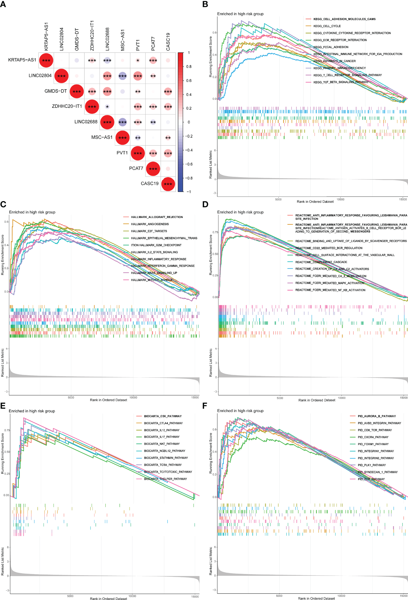 Co-expression network and functional enrichment analysis of m7Gscore-defined groups. (A) Co-expressed correlation among the hub m7G-related lncRNAs in PCa. (B–F) GSEA results of KEGG (B), Hallmark (C), Reactome (D), BioCarta (E), and PID (F). lncRNAs, long non-coding RNAs; PCa, prostate cancer; GSEA, gene set enrichment analysis. *p < 0.05; **p < 0.01; ***p < 0.001.