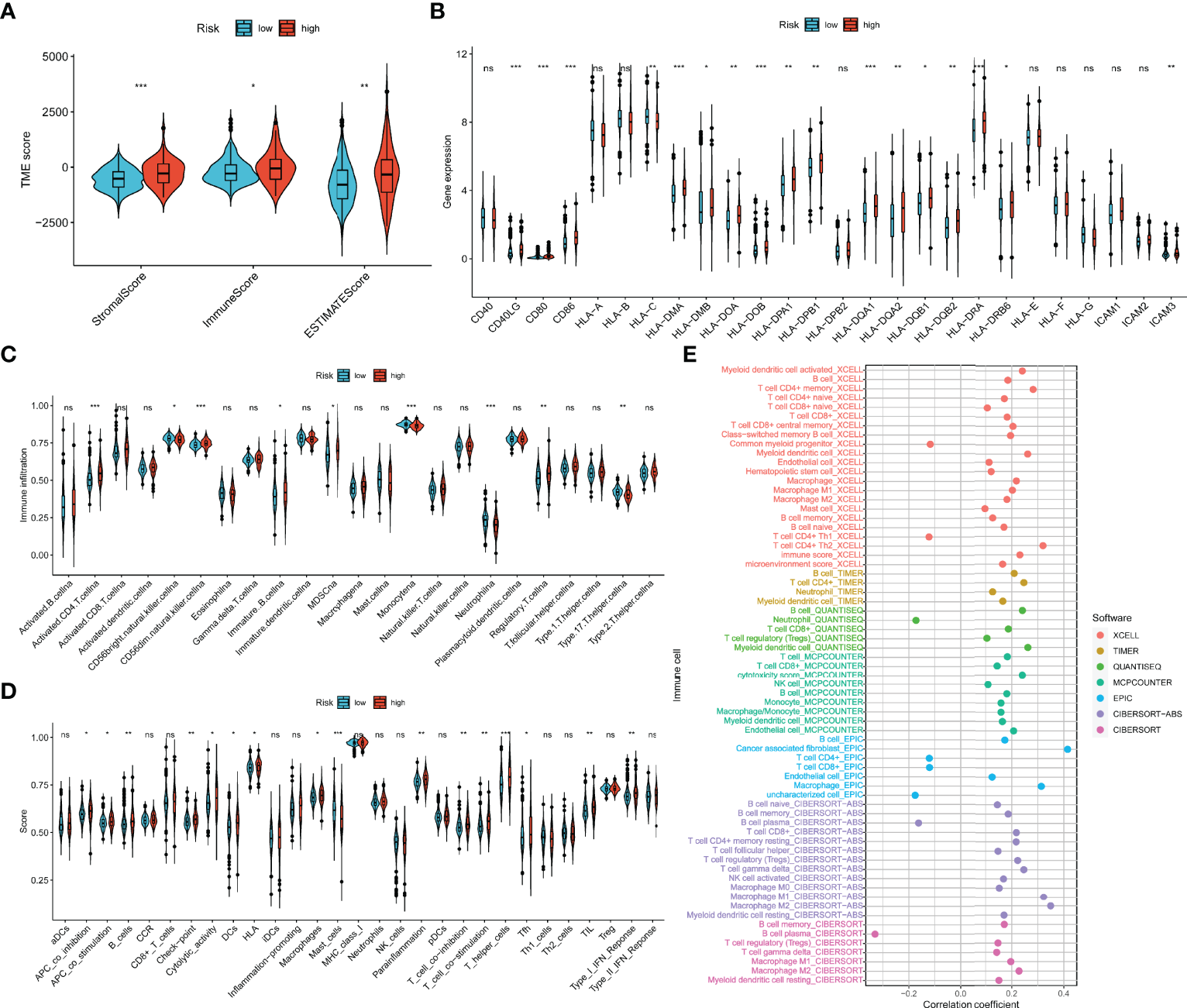 Association between the TIME and m7G model. (A) The ESTIMATE of tumor microenvironment in the two m7Gscore-defined groups. (B) MHC, costimulatory, and adhesion molecule expression in the m7Gscore-defined groups. (C, D) Enrichment indices of TIICs (C) and immune functions (D) in the m7Gscore-defined groups with ssGSEA. (E) Evaluation of the correlation between m7Gscore and the infiltration level of TIICs with comprehensive algorithms. TIME, tumor immune microenvironment; m7G, 7-methylguanosine; MHC, major histocompatibility complex; TIICs, tumor-infiltrating immune cells; ssGSEA, single-sample gene set enrichment analysis. *p < 0.05; **p < 0.01; ***p < 0.001. ns, no significance.