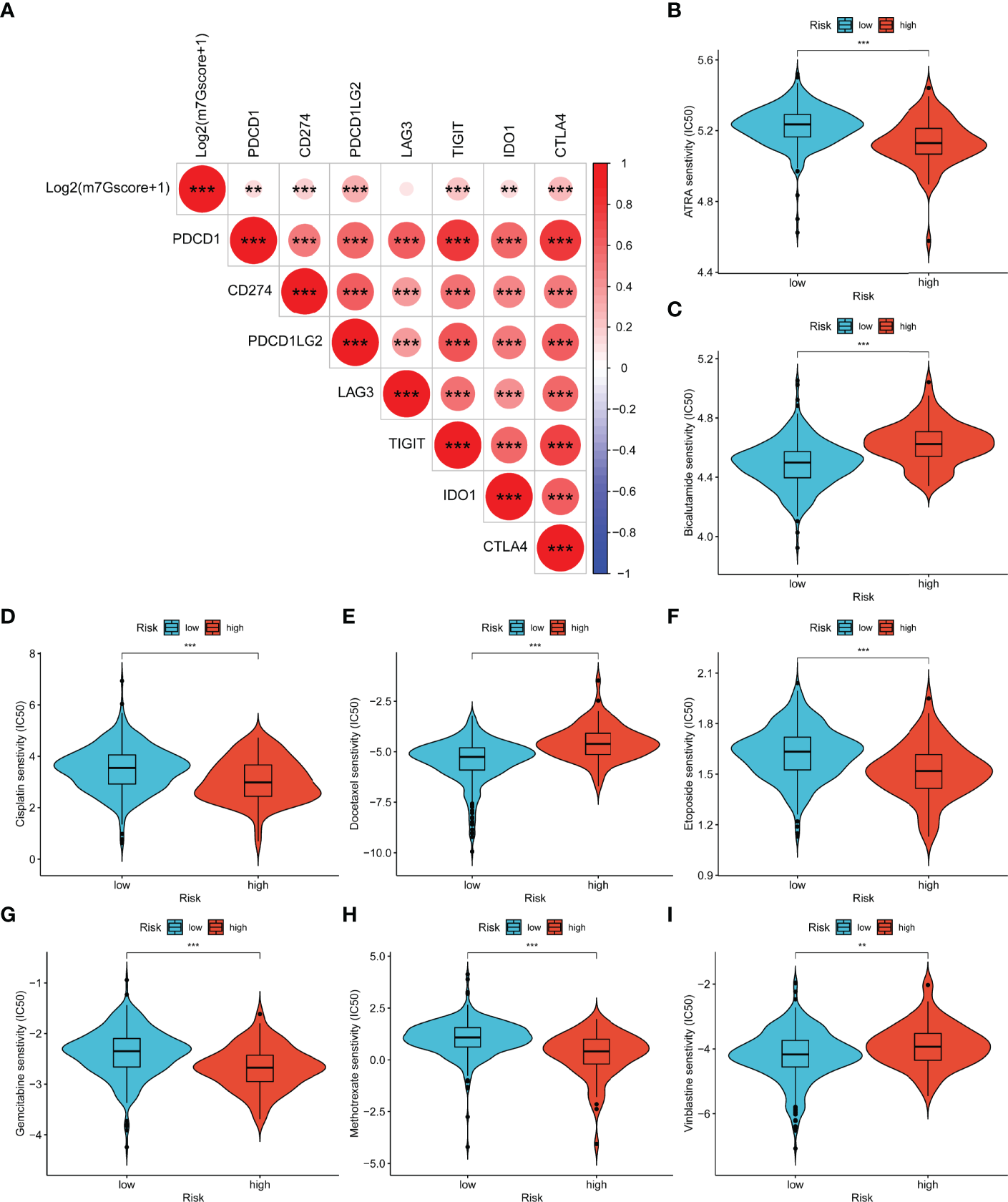 Relevance between m7Gscore and drug sensitivity. (A) The prediction of immunotherapy efficacy with the correlation between m7Gscore and immune checkpoint expression. (B–I) The IC50 of m7Gscore-defined subgroups to drugs, including ATRA (B), bicalutamide (C), cisplatin (D), docetaxel (E), etoposide (F), gemcitabine (G), methotrexate (H), and vinblastine (I). **p < 0.01; ***p < 0.001.