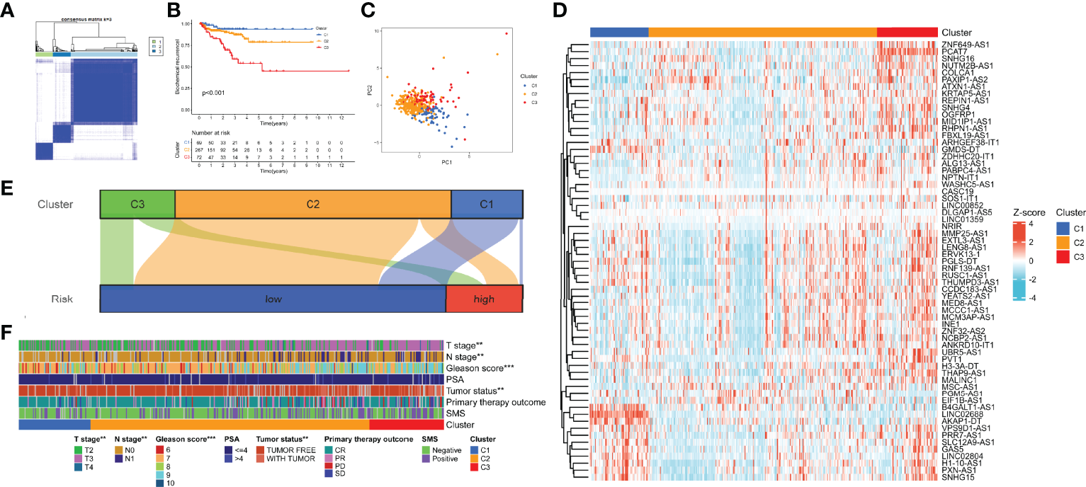 Identification of m7G-related patterns by consensus matrix factorization. (A) Consensus matrix. (B) BCR-free survival in m7G phenotypes with Kaplan–Meier curves. (C) The expression characteristics of m7G-related lncRNAs of m7G phenotypes with PCA diagram. (D) Expression of the m7G-related lncRNAs in m7G-related patterns. (E) Distribution of samples in m7G-related patterns in the high- and low-risk groups with Sankey diagram. (F) Correlations between m7G-related patterns and clinicopathological parameters. m7G, 7-methylguanosine; BCR, biochemical recurrence; lncRNAs, long non-coding RNAs; PCA, principal component analysis. **p < 0.01; ***p < 0.001.