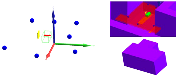 * six 20-cm-diameter spherical air cells at the detector positions for tallying the neutron fluence energy spectrum and neutron H*(10) (blue).