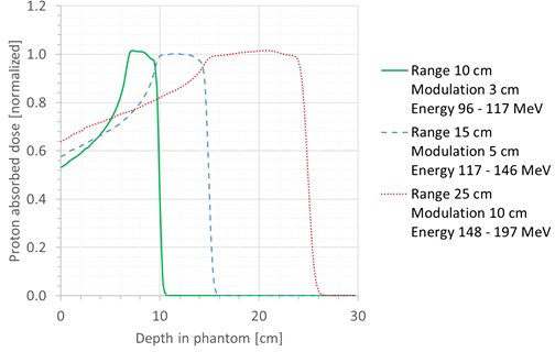 | Center | Range shifter (RS) | Air gap RS-phantom [cm] | Field size [cm2] | Proton energies [MeV] | Range [cm] | SOBP modulation width [cm] |