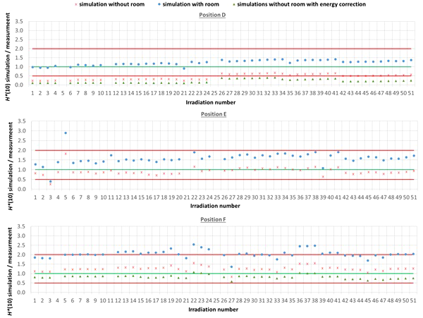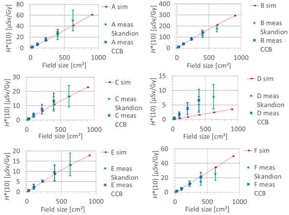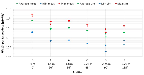The MC simulations were verified by measurements with ambient neutron monitors during the measurement campaigns at Skandion and CCB. Ambient neutron monitors measure the neutron dose in terms of the quantity ambient dose equivalent H*(10). This quantity, as defined in (6), is a measurable operational quantity that provides a conservative estimate of the radiation protection quantity effective dose. Due to limitations in experimental time and ambient neutron monitor availability, it was not possible to use the same type of ambient neutron monitor at all six positions. However, the specific aspects and uncertainties of each monitor were taken into account in the data analysis. Therefore, different types of ambient neutron monitors from the different institutes participating in the measurement campaigns were used. However, each ambient neutron monitor was kept at a fixed position throughout the whole measurement campaign. The institute and type of the ambient neutron monitors used at the six measurement positions in Skandion and CCB are listed in Table 2. On the second and third lines in Table 2, also the manufacturer and the calibration date and source are specified for each monitor. All calibrations were still valid at the time of the measurement campaigns according to the calibration procedures of the respective institutes.