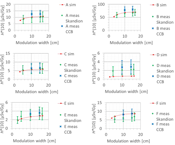 Also, the dependence of the neutron H*(10) on the air gap between the range shifter and the phantom was studied, in both the simulations and the measurements. The error bars on the measurement data points represent the k = 1 measurement uncertainties. Figure 15 shows the variation of the simulated H*(10) (red bars connected with lines) and measured H*(10) (green crosses) as a function of the air gap between the range shifter and the phantom for a range of 10 cm, a modulation width of 5 cm, and a field size of 10 cm × 10 cm for the different positions. Both the simulations and the measurements at Skandion showed no significant effect of the variation of the air gap on the neutron H*(10) for the investigated positions. Further research is necessary to evaluate the potential influence of the air gap at other positions such as inside the phantom, closer to the range shifter. The absorbed dose measured at position A with the Sievert was shown to increase with increasing air gap. This increase is probably not due to neutrons but due to protons from the range shifter as discussed in detail in (23).