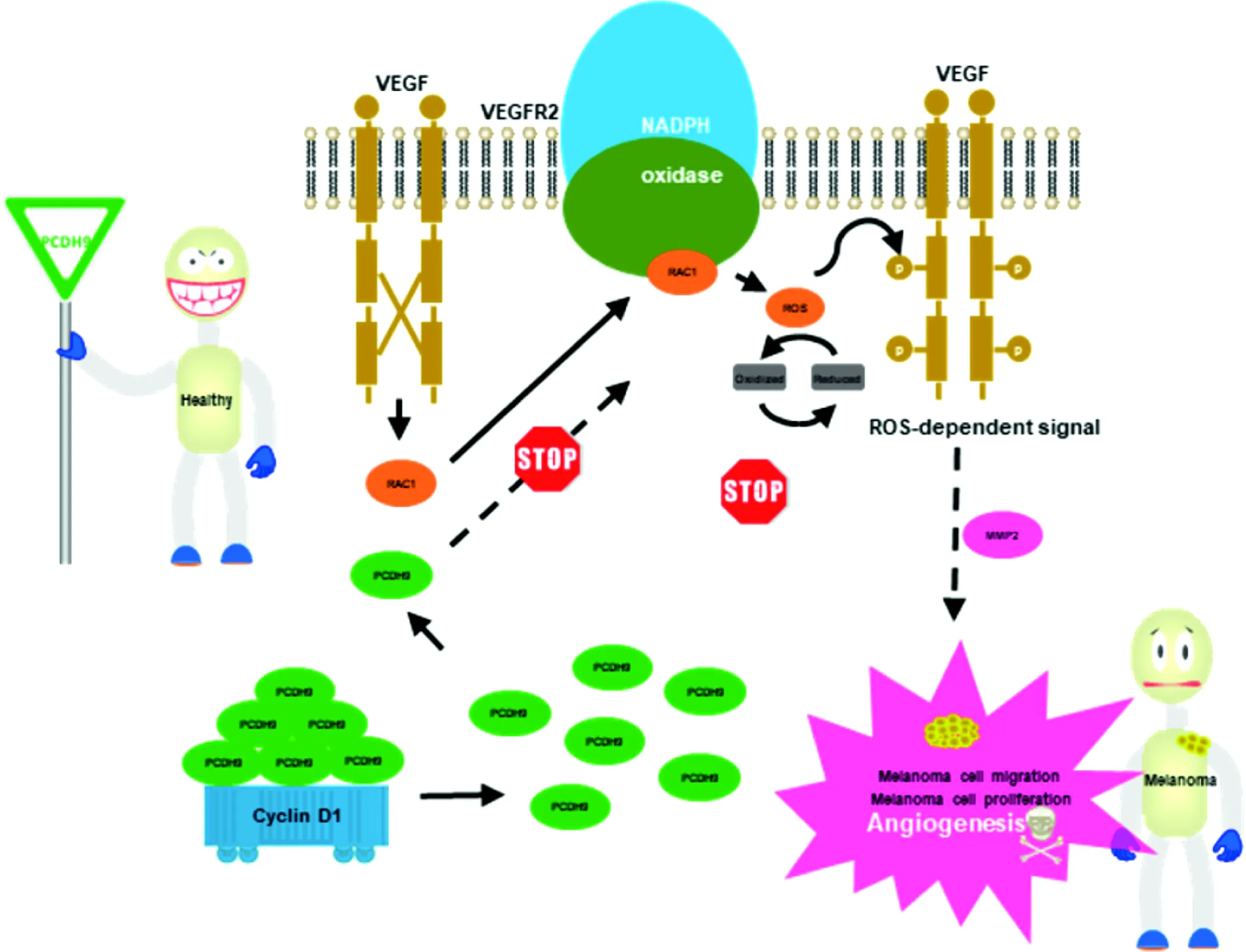 Proposed model for the role of PCHD9 regulates melanoma. Increase of PCDH9 suppressed NADPH oxidase activity, decreased ROS generation, and ROS-induced angiogenesis. PCDH9 can target complex-bound Rac1 to weaken angiogenesis by regulating NADPH oxidase, ROS production, and DNA damage susceptibility through cyclin D1 trafficking. VEGF binding to VEGFR2 leads to activating and translocating RAC1 into the plasma membrane. Whereas ROS-dependent signaling events may trigger angiogenesis (i.e., cell migration and proliferation) and influence MMP2 that affect growth factor and tumor promoter stimulation as well.