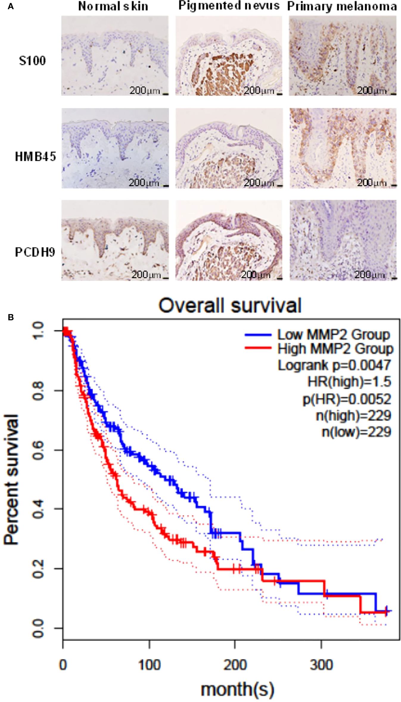 (A) Immunohistochemical analyses of PCDH9 expression in normal skin, pigmented nevus, and melanoma tissue. Positive percentage of PCDH9 expression was lower in human melanoma tissue than in normal skin or/and pigmented nevus tissue. PCDH9 was mainly expressed in cytoplasm but a small amount in nuclei. S100 and HMB45 are melanoma markers. The scale bar represents 200 μm. (B) Survival curves of MMP2 in normal and skin cutaneous melanoma (SKCM) tissues based on TCGA data in GEPIA. Red line represents the samples with MMP2 highly expressed (n = 229), whereas blue line exhibits lowly expression (n = 229) (log rank, p = 0.0047). HR represents hazard ratio. The p-value of HR is less 0.05 (p = 0.0052).