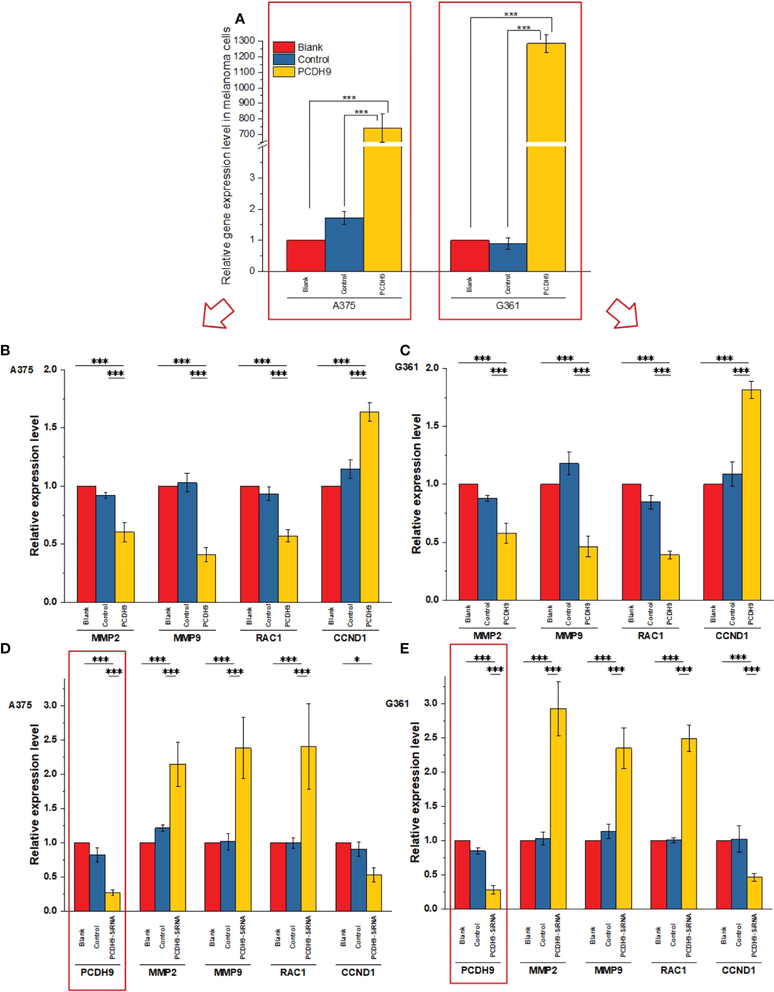 Effects of overexpressed and interfered PCDH9 in melanoma cells measured by PCR analysis (A). The expressions of PCDH9 were significantly upregulated by lentivirus infection. Overexpressed PCDH9 significantly upregulated CCND1 and downregulated RAC1 and MMP9 in both cells [A375 (B) and G361 (C)]. Interfered PCDH9 downregulated CCND1 and upregulated RAC1 and MMP2 in both cells [A375 (D) and G361 (E)]. *p < 0.05, and ***p < 0.001 compared in groups by using one-way ANOVA followed by least significant difference post hoc tests.