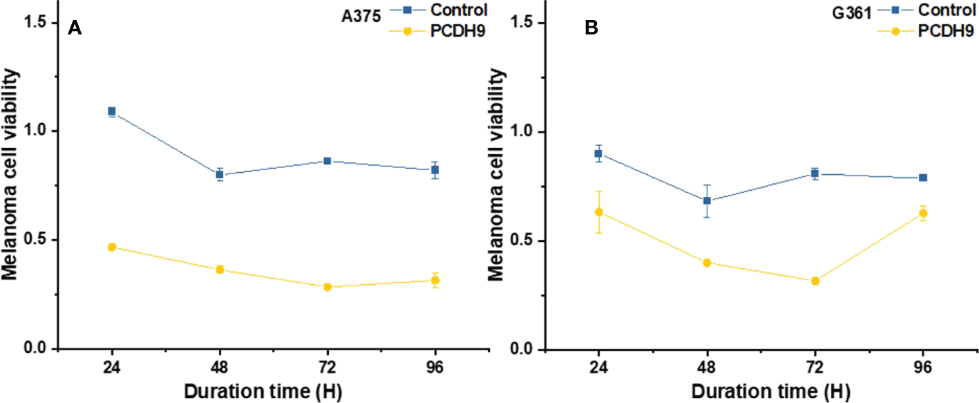 The overexpression of PCDH9 reduced the proliferation of melanoma cells. Overexpressed PCDH9 groups showed indeed a lower viability than control groups (Figure 3). As time passed, the viability of melanoma cells tended to stabilize, but PCDH9-overexpressed groups had less viable cells than control groups in different durations, and the differences between PCDH9 and control groups were significant (24, 48, 72, and 96 h) (Figures 3A, B).