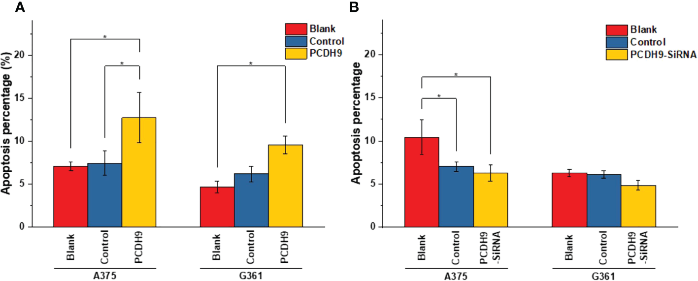 The apoptosis percentage of PCDH9 overexpression was exhibited by (A) A375 and (B) G361. The overexpression of PCDH9 significantly promoted apoptosis in both cell lines. *p< 0.05 compared in groups by using one-way ANOVA followed by least significant difference post hoc tests. The interference of PCDH9 reduced apoptosis in A375 cell line and in a more modest manner in G361 cell lines. *p < 0.05 compared in groups by using one-way ANOVA followed by least significant difference post hoc tests.