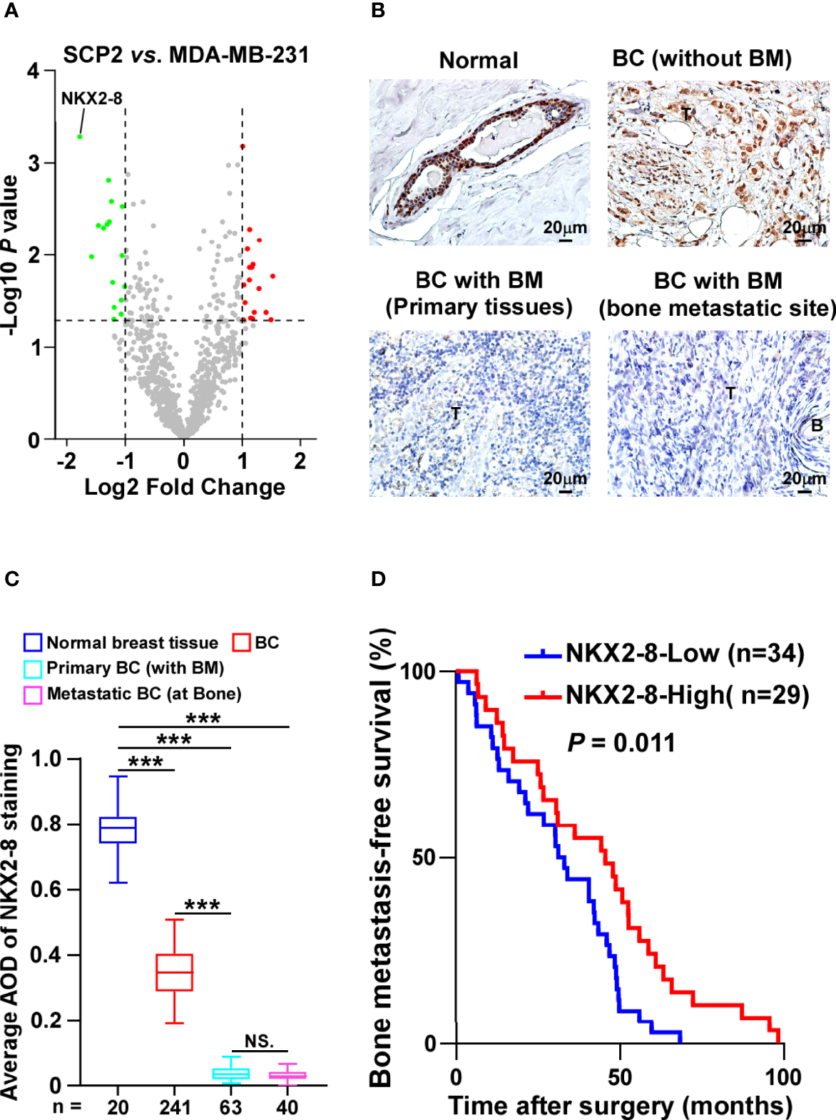 NKX2-8 is associated with progression of bone-metastasis in breast cancer. (A) The upregulated and downregulated proteins in SCP2 cells compared with MDA-MB-231 cells were analyzed using Volcano plot. (B, C) Representative IHC images (B) and quantification (C) of NKX2-8 level in normal breast tissue (n = 20), primary non-bone metastatic breast cancer tissues (n = 241), primary bone-metastatic breast cancer tissues (n = 63), and bone-metastatic breast cancer tissues (n = 40). Scale bar, 50 µm. (D) Kaplan-Meier analysis of bone metastasis-free survival curves in patients with NKX2-8 high- vs. low-expressed breast cancer with bone metastasis (n = 63; P = 0.011, log-rank test). *** means P < 0.001, N.S. means not significant (P > 0.05).