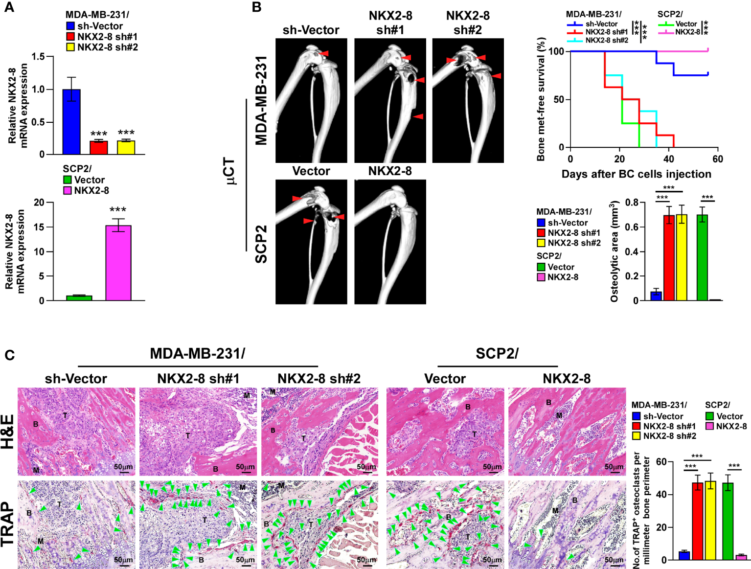 The biological role of NKX2-8 in breast cancer organ-specific metastasis was then examined using NKX2-8-silenced SCP-2 and NKX2-8–overexpressing MDA-MB-231 breast cancer cell lines (Figure 2A), and then injected intracardially the corresponding cells into nude mice. The NKX2-8-silenced breast cancer cells-injected mice exhibited earlier bone metastases, as revealed by μCT analysis, and histology examination (Figures 2B, C). Consistently, compared with that in the control mice, the NKX2-8-overexpressing breast cancer cells displayed delayed bone metastases, and reduced bone metastasis lesions/osteolytic areas (Figures 2B, C). Histological TRAP staining showed that NKX2-8-overexpressing breast cancer cells significantly suppressed activation of osteoclasts (Figure 2C). Collectively, these results demonstrated the NKX2-8 specifically inhibits bone metastasis of breast cancer cells by reducing osteoclastogenesis.