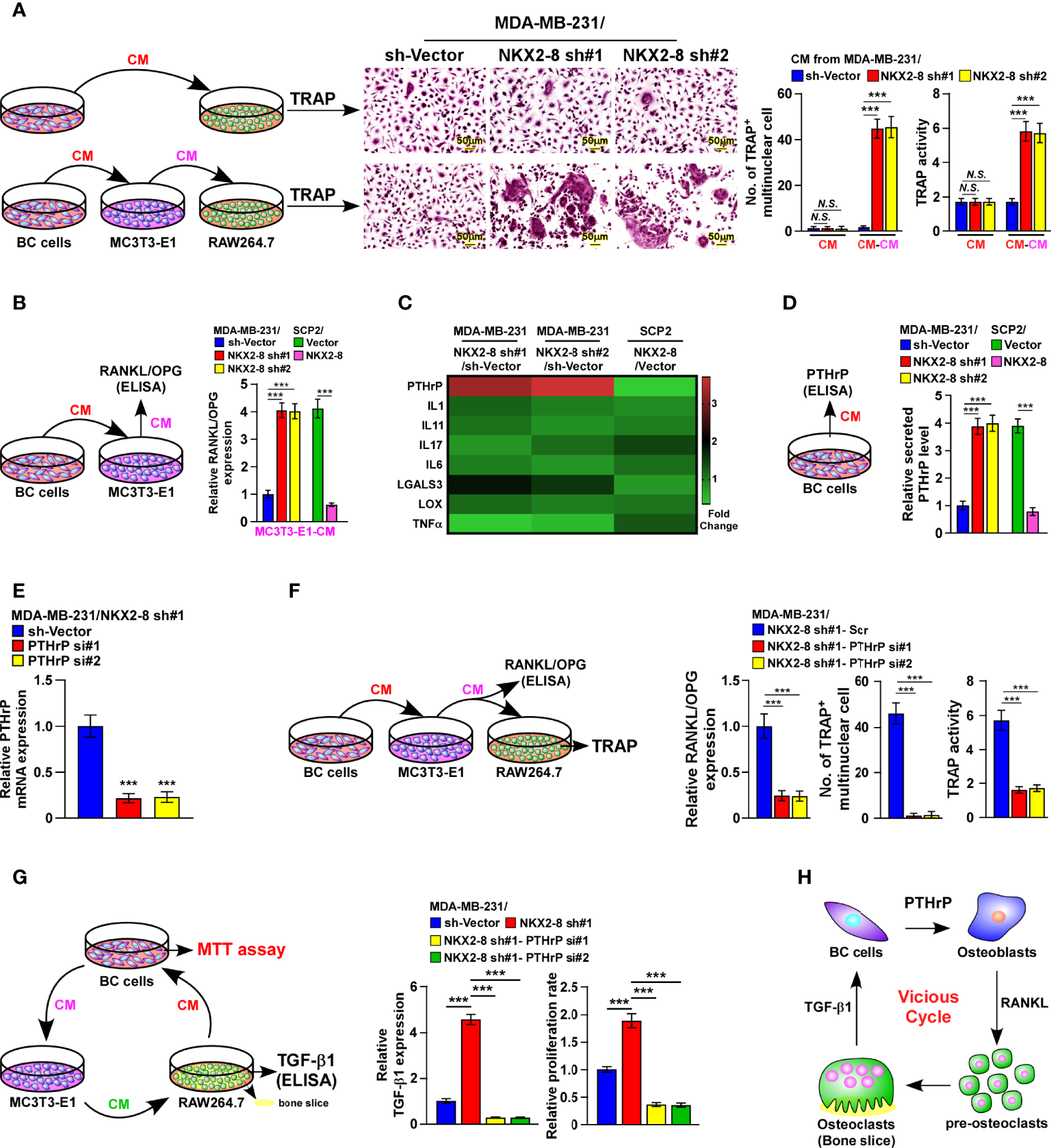 NKX2-8 silencing-induced PTHrP promotes osteoclastogenesis in vitro. (A) Left: schematic illustration of osteoclastogenesis under treatment with CM from breast cancer cells or from osteoblasts pretreated with CM from breast cancer cells. Middle: osteoclast differentiation assays assessed using TRAP staining cultured CM obtained from the indicated cells. Right: Quantification of the number of TRAP-positive multinuclear osteoclasts and TRAP activity. (B) ELISA analysis of the RANKL/OPG ratio in CM from osteoblast precursor cells MC3T3-E1 cells cultured in the CM obtained from the indicated breast cancer cells. (C) Real-time PCR analysis indicating osteoclastogenesis regulator expression in the indicated cells. The pseudocolor represents the intensity scale of genes in the indicated cells generated by a log2 transformation. GAPDH serves as the loading control. (D) ELISA analysis of secreted PTHrP levels in CM from the indicated cells. (E) Real-time PCR analysis of PTHrP levels in sh-vector- and PTHrP-shRNA(s)-transduced MDA-MB-231/NKX2-8 sh#1 cells. GAPDH served as the loading control. (F) Left: schematic illustration of osteoclastogenesis under treatment with CM from osteoblasts pretreated with CM from breast cancer cells. Right: ELISA analysis of the RANKL/OPG ratio in CM from osteoblast precursor cells MC3T3-E1 cells in the presence of CM from the indicated breast cancer cells, and quantification of the TRAP-positive multinuclear osteoclasts number and TRAP activity cultured in the CM obtained from the indicated cells. (G) Left: schematic illustration of breast cancer CM-induced “vicious cycle” between the indicated cells. Middle: The TGF-β1 levels analyzed using ELISA assay in CM from RAW 264.7 cells cultured onto the bone slice in CM obtained from the breast cancer cells. Right: MTT assay analysis of proliferation rate of indicated cells from experiment in left panel. (H) Schematic illustration of PTHrP-induced “vicious cycle” between the indicated cells. BC: Breast Cancer. N.S. means not significant (P > 0.05), *** means P < 0.001.