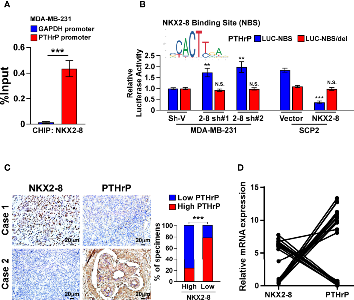NKX2-8 transcriptionally represses PTHrP. (A) ChIP analysis of the enrichment of NKX2-8 on promoter of PTHrP gene in MDA-MB-231 cells. (B) Relative luciferase activities of the PTHrP promoter in the indicated breast cancer cells. (C) NKX2-8 levels were negatively associated with PTHrP expression in breast cancer tissues (n = 304). The representative IHC staining images (left) and expression correlation (right) of NKX2-8 and PTHrP protein in breast cancer tissues. Scale bars, 20 µm. (D) Relative expression of NKX2-8 and PTHrP in primary breast cancer tissues (n = 20) with bone metastasis (n = 10; P < 0.001). ** means P < 0.01., *** means P < 0.001 N.S. means not significant (P > 0.05).
