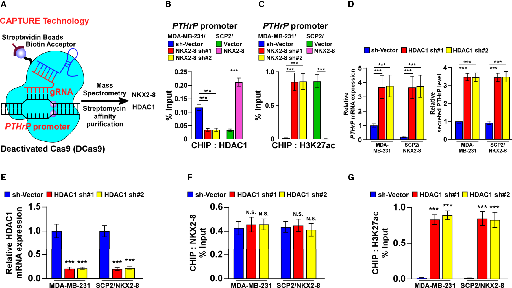 NKX2-8 interacts with HDAC1 in NKX2-8-inhibited PTHrP transcription. (A) Schematic diagram of interaction between NKX2-8 and the HDAC1 in the PTHrP promoter using CAPATURE approach. (B) ChIP analysis of the enrichment of HDAC1 in the PTHrP promoter in the indicated breast cancer cells. (C) ChIP analysis of the enrichment of H3K27ac in the PTHrP promoter in the indicated breast cancer cells. (D) Real-time PCR analysis of PTHrP mRNA (left) and ELISA analysis of serum PTHrP (right) expression in the indicated cells. GAPDH was used as the loading control. (E) The relative expression of HDAC1 in the indicated cells using real-time PCR analysis. GAPDH served as the loading control. (F) ChIP analysis of the association of NKX2-8 with the promoter of PTHrP gene in the indicated breast cancer cells. (G) The relative enrichment of H3K27ac on the PTHrP promoter determined by ChIP analysis in the indicated breast cancer cells. N.S. means not significant (P > 0.05), *** means P < 0.001.