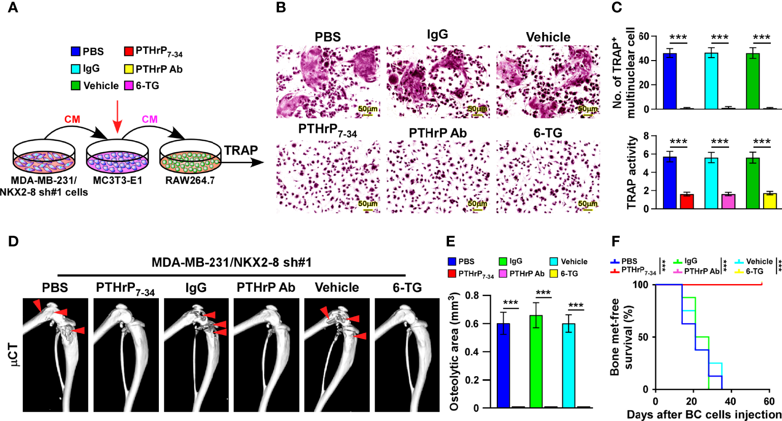 To determine the critical effect of tumor-derived PTHrP on NKX2-8 silencing-mediated osteoclastogenesis, the osteoclast precursor cells was treated with three types of PTHrP inhibitors, including the peptide antagonist PTHrP7–34, the neutralizing antibody and the chemical inhibitor 6-thioguanine (6-TG), under conditions of CM from NKX2-8-silenced cells. Osteoclastogenesis analyses indicated that all three type of inhibitors efficiently impaired the osteoclastogenesis effects of the CM from NKX2-8-silenced cells, as PTHrP inhibition completely abolishing the induced effects of NKX2-8 silencing on the TRAP-positive multinuclear osteoclasts and TRAP enzymatic activity (Figures 7A–C). These results further supported the notion that NKX2-8 inhibited osteoclastogenesis via PTHrP in vitro. Moreover, we found that treatment with all three PTHrP inhibitor exhibited dramatic blocked effect on vicious cycle induced by silencing NKX2-8, as indicated by decreased level of bone matrix-released TGF-β1 and slower growth rates of breast cancer cells (Supplementary Figure 4). Therefore, our results indicate that targeting PTHrP contributes to inhibition of the osteoclastogenesis and vicious cycle induced by NKX2-8 silencing.